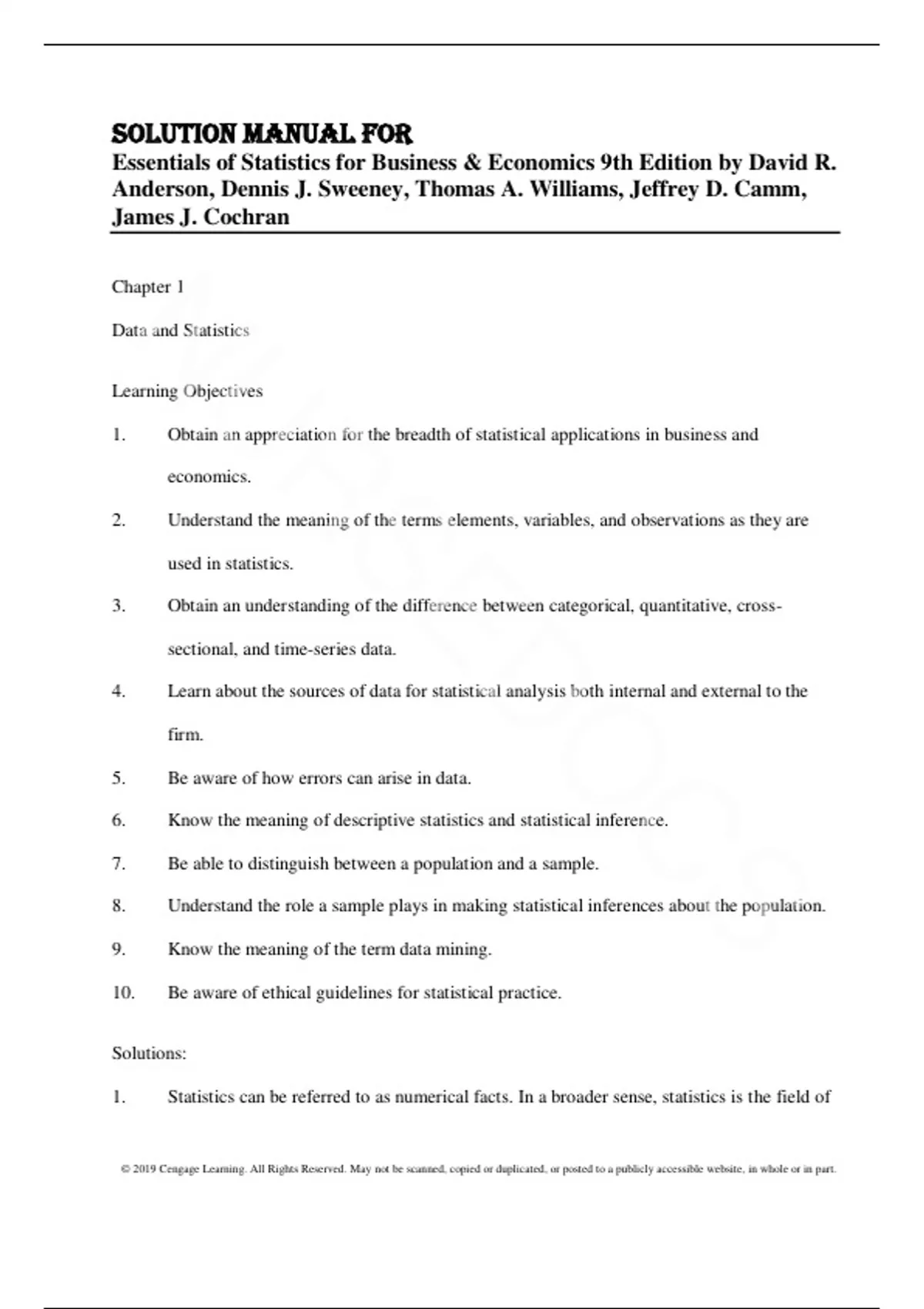Solution Manual For Essentials of Statistics for Business & Economics 9th Edition by David R. Anderson, Dennis J. Sweeney, Thomas A. Williams, Jeffrey D. Camm, James J. Cochran