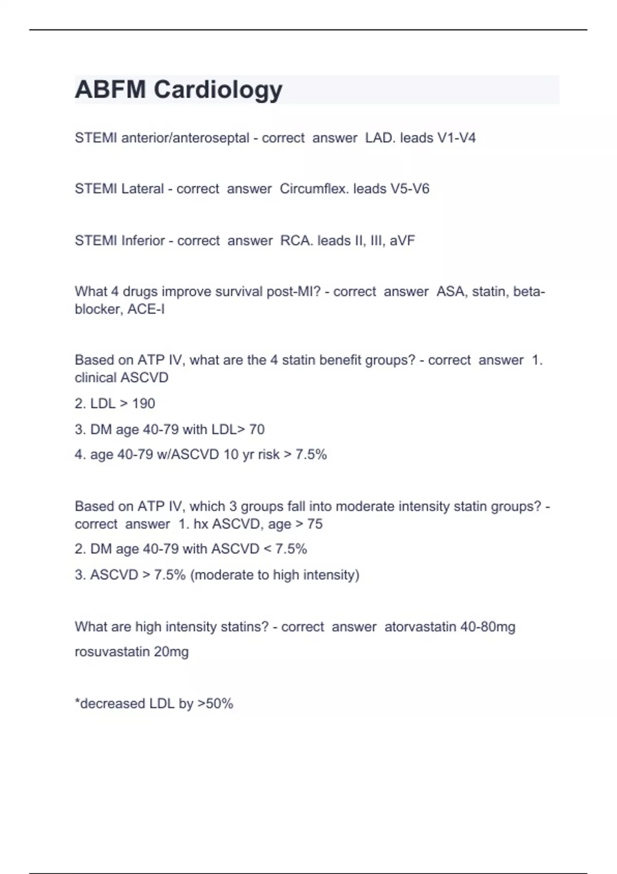 ABFM CardiologySTEMI anterior/anteroseptal - correct answer LAD. leads V1-V4 STEMI Lateral - correct answer Circumflex. leads V5-V6 STEMI Inferior - correct answer RCA. leads II, III, aVF What 4 drugs improve survival post-MI? - correct answer ASA, statin, beta-blocker, ACE-I Based on ATP IV, what are the 4 statin benefit groups? - correct answer 1. clinical ASCVD 2. LDL > 190 3. DM age 40-79 with LDL> 70 4. age 40-79 w/ASCVD 10 yr risk > 7.5% Based on ATP IV, which 3 groups fall into moderate intensity statin groups? - correct answer 1. hx ASCVD, age > 75 2. DM age 40-79 with ASCVD < 7.5% 3. ASCVD > 7.5% (moderate to high intensity) What are high intensity statins? - correct answer atorvastatin 40-80mg rosuvastatin 20mg *decreased LDL by >50%