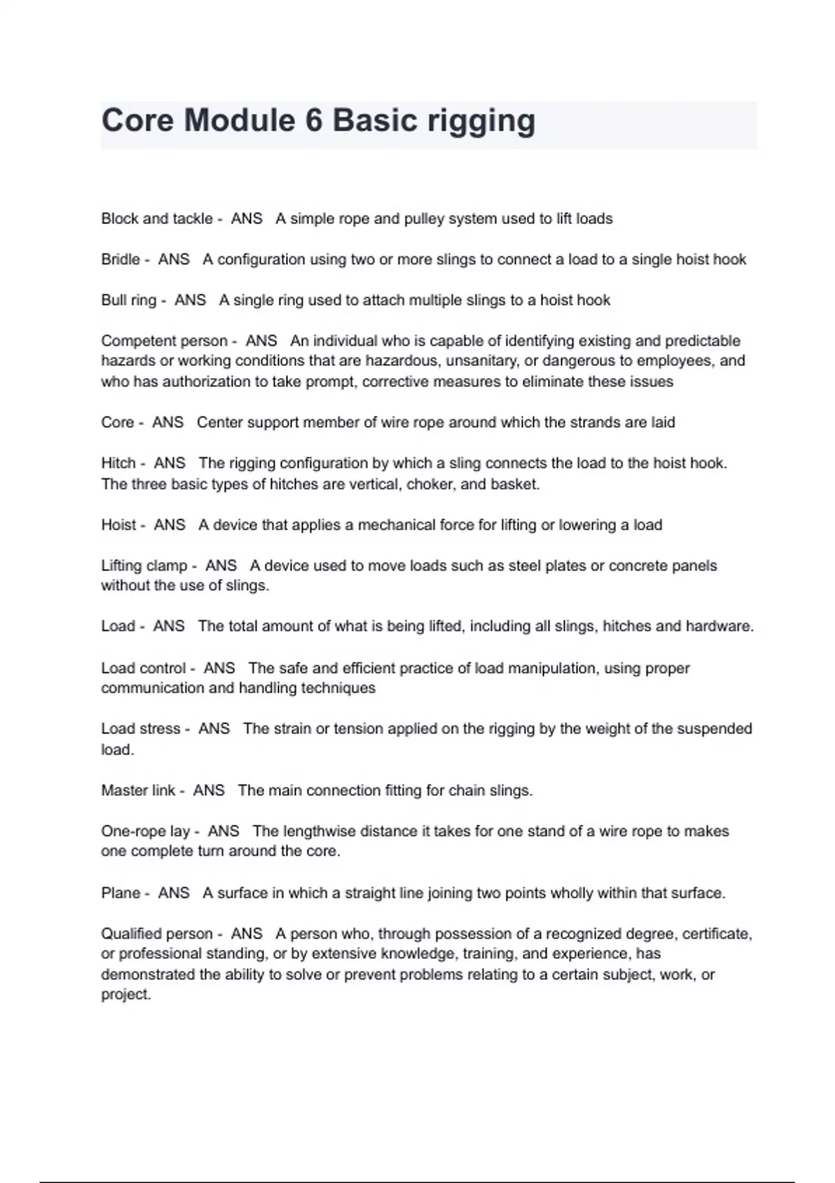 Core Module 6 Basic rigging Exam Questions And Answers Block and tackle - ANS A simple rope and pulley system used to lift loads Bridle - ANS A configuration using two or more slings to connect a load to a single hoist hook Bull ring - ANS A single ring used to attach multiple slings to a hoist hook Competent person - ANS An individual who is capable of identifying existing and predictable hazards or working conditions that are hazardous, unsanitary, or dangerous to employees, and who has authorization to take prompt, corrective measures to eliminate these issues Core - ANS Center support member of wire rope around which the strands are laid Hitch - ANS The rigging configuration by which a sling connects the load to the hoist hook. The three basic types of hitches are vertical, choker, and basket. Hoist - ANS A device that applies a mechanical force for lifting or lowering a load Lifting clamp - ANS A device used to move loads such as steel plates or concrete panels without the use of slings. Load - ANS The total amount of what is being lifted, including all slings, hitches and hardware. Load control - ANS The safe and efficient practice of load manipulation, using proper communication and handling techniques Load stress - ANS The strain or tension applied on the rigging by the weight of the suspended load. Master link - ANS The main connection fitting for chain slings. One-rope lay - ANS The lengthwise distance it takes for one stand of a wire rope to makes one complete turn around the core.