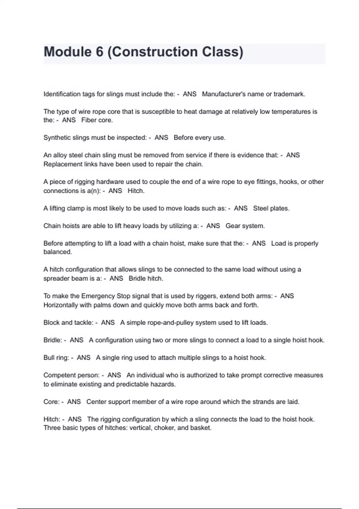 Module 6 (Construction Class) Exam Questions And Answers Identification tags for slings must include the: - ANS Manufacturer's name or trademark. The type of wire rope core that is susceptible to heat damage at relatively low temperatures is the: - ANS Fiber core. Synthetic slings must be inspected: - ANS Before every use. An alloy steel chain sling must be removed from service if there is evidence that: - ANS Replacement links have been used to repair the chain. A piece of rigging hardware used to couple the end of a wire rope to eye fittings, hooks, or other connections is a(n): - ANS Hitch. A lifting clamp is most likely to be used to move loads such as: - ANS Steel plates. Chain hoists are able to lift heavy loads by utilizing a: - ANS Gear system. Before attempting to lift a load with a chain hoist, make sure that the: - ANS Load is properly balanced. A hitch configuration that allows slings to be connected to the same load without using a spreader beam is a: - ANS Bridle hitch. To make the Emergency Stop signal that is used by riggers, extend both arms: - ANS Horizontally with palms down and quickly move both arms back and forth. Block and tackle: - ANS A simple rope-and-pulley system used to lift loads. Bridle: - ANS A configuration using two or more slings to connect a load to a single hoist hook.