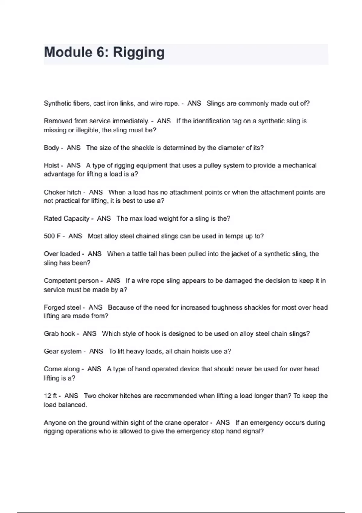 Module 6: Rigging Exam Questions And Answers Synthetic fibers, cast iron links, and wire rope. - ANS Slings are commonly made out of? Removed from service immediately. - ANS If the identification tag on a synthetic sling is missing or illegible, the sling must be? Body - ANS The size of the shackle is determined by the diameter of its? Hoist - ANS A type of rigging equipment that uses a pulley system to provide a mechanical advantage for lifting a load is a? Choker hitch - ANS When a load has no attachment points or when the attachment points are not practical for lifting, it is best to use a? Rated Capacity - ANS The max load weight for a sling is the? 500 F - ANS Most alloy steel chained slings can be used in temps up to? Over loaded - ANS When a tattle tail has been pulled into the jacket of a synthetic sling, the sling has been? Competent person - ANS If a wire rope sling appears to be damaged the decision to keep it in service must be made by a?