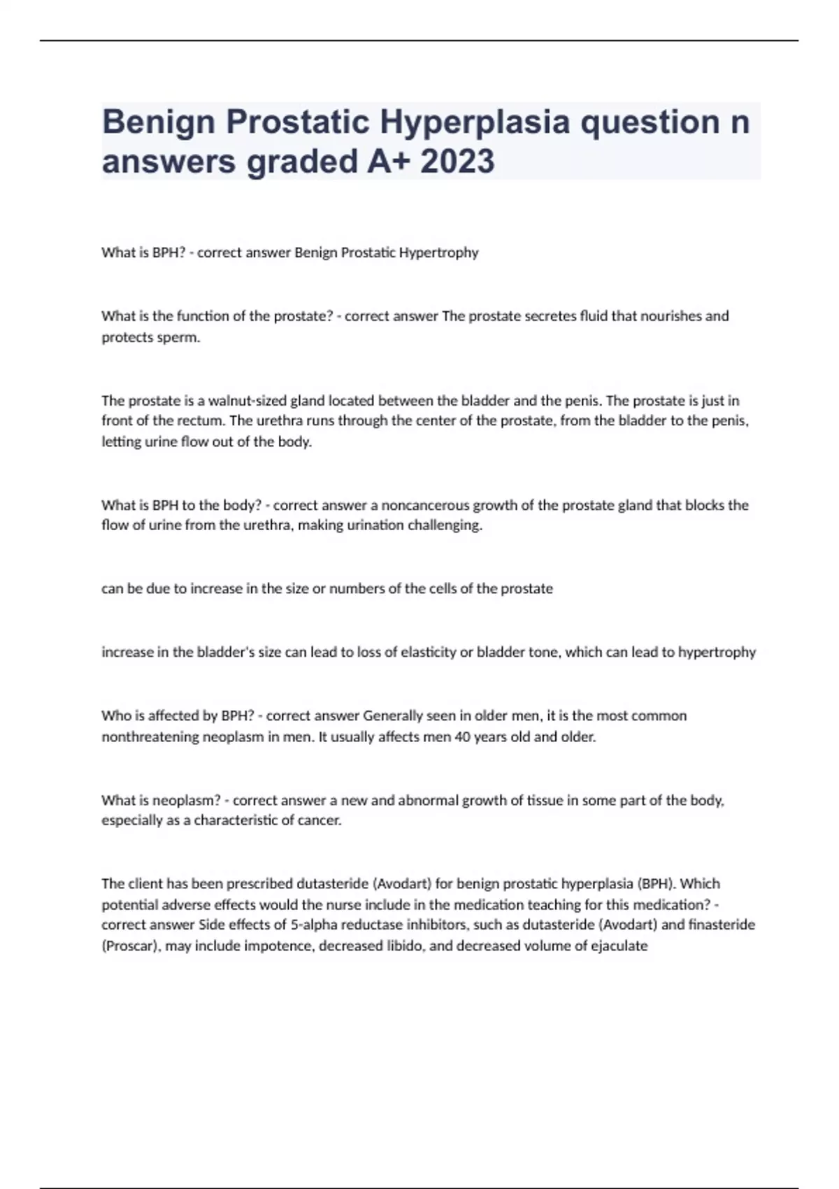 Benign Prostatic Hyperplasia question n answers graded A+ 2023What is BPH? - correct answer Benign Prostatic Hypertrophy What is the function of the prostate? - correct answer The prostate secretes fluid that nourishes and protects sperm. The prostate is a walnut-sized gland located between the bladder and the penis. The prostate is just in front of the rectum. The urethra runs through the center of the prostate, from the bladder to the penis, letting urine flow out of the body. What is BPH to the body? - correct answer a noncancerous growth of the prostate gland that blocks the flow of urine from the urethra, making urination challenging. can be due to increase in the size or numbers of the cells of the prostate increase in the bladder's size can lead to loss of elasticity or bladder tone, which can lead to hypertrophy Who is affected by BPH? - correct answer Generally seen in older men, it is the most common nonthreatening neoplasm in men. It usually affects men 40 years old and older. What is neoplasm? - correct answer a new and abnormal growth of tissue in some part of the body, especially as a characteristic of cancer. The client has been prescribed dutasteride (Avodart) for benign prostatic hyperplasia (BPH). Which potential adverse effects would the nurse include in the medication teaching for this medication? - correct answer Side effects of 5-alpha reductase inhibitors, such as dutasteride (Avodart) and finasteride (Proscar), may include impotence, decreased libido, and decreased volume of ejaculate