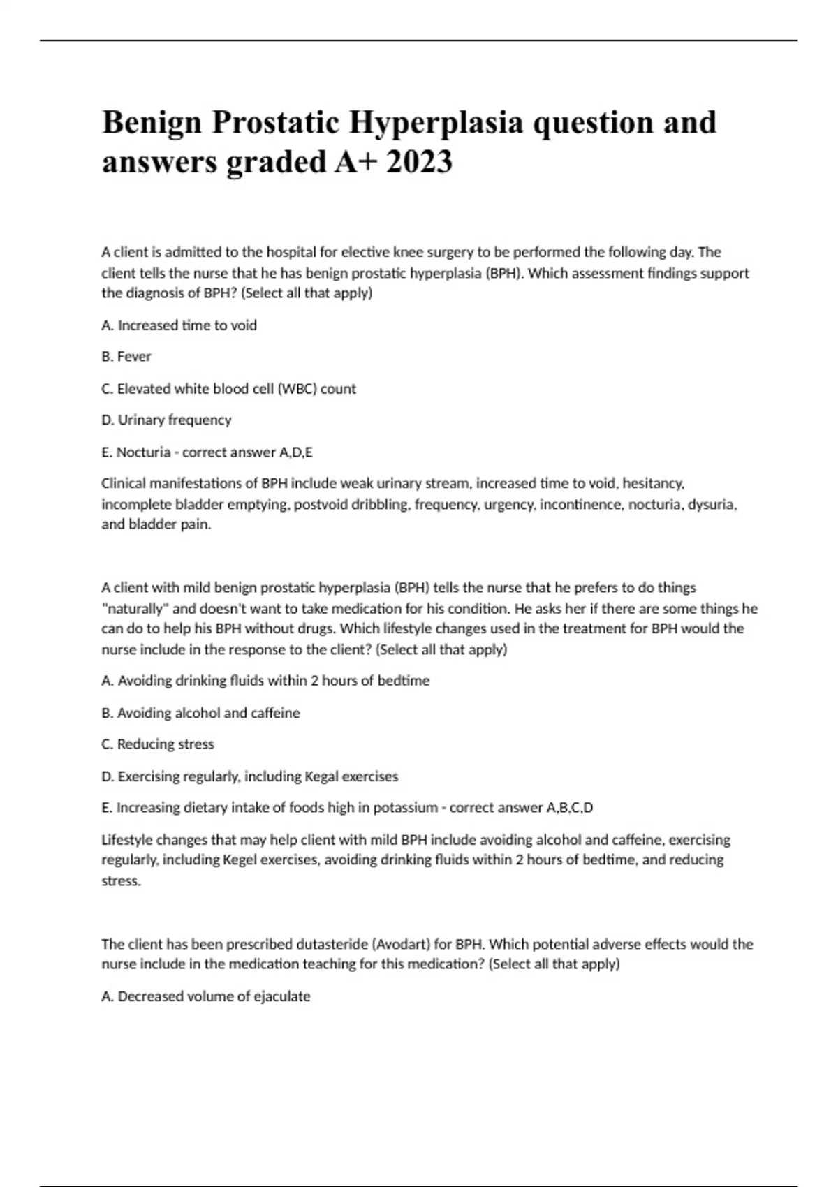 Benign Prostatic Hyperplasia question and answers graded A+ 2023A client is admitted to the hospital for elective knee surgery to be performed the following day. The client tells the nurse that he has benign prostatic hyperplasia (BPH). Which assessment findings support the diagnosis of BPH? (Select all that apply) A. Increased time to void B. Fever C. Elevated white blood cell (WBC) count D. Urinary frequency E. Nocturia - correct answer A,D,E Clinical manifestations of BPH include weak urinary stream, increased time to void, hesitancy, incomplete bladder emptying, postvoid dribbling, frequency, urgency, incontinence, nocturia, dysuria, and bladder pain. A client with mild benign prostatic hyperplasia (BPH) tells the nurse that he prefers to do things "naturally" and doesn't want to take medication for his condition. He asks her if there are some things he can do to help his BPH without drugs. Which lifestyle changes used in the treatment for BPH would the nurse include in the response to the client? (Select all that apply) A. Avoiding drinking fluids within 2 hours of bedtime B. Avoiding alcohol and caffeine C. Reducing stress D. Exercising regularly, including Kegal exercises E. Increasing dietary intake of foods high in potassium - correct answer A,B,C,D Lifestyle changes that may help client with mild BPH include avoiding alcohol and caffeine, exercising regularly, including Kegel exercises, avoiding drinking fluids within 2 hours of bedtime, and reducing stress. The client has been prescribed dutasteride (Avodart) for BPH. Which potential adverse effects would the nurse include in the medication teaching for this medication? (Select all that apply) A. Decreased volume of ejaculate