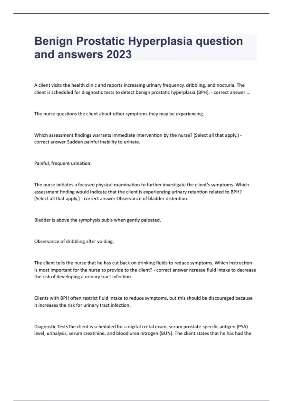 Benign Prostatic Hyperplasia question and answers 2023A client visits the health clinic and reports increasing urinary frequency, dribbling, and nocturia. The client is scheduled for diagnostic tests to detect benign prostatic hyperplasia (BPH). - correct answer ... The nurse questions the client about other symptoms they may be experiencing. Which assessment findings warrants immediate intervention by the nurse? (Select all that apply.) - correct answer Sudden painful inability to urinate. Painful, frequent urination. The nurse initiates a focused physical examination to further investigate the client's symptoms. Which assessment finding would indicate that the client is experiencing urinary retention related to BPH? (Select all that apply.) - correct answer Observance of bladder distention. Bladder is above the symphysis pubis when gently palpated. Observance of dribbling after voiding. The client tells the nurse that he has cut back on drinking fluids to reduce symptoms. Which instruction is most important for the nurse to provide to the client? - correct answer ncrease fluid intake to decrease the risk of developing a urinary tract infection. Clients with BPH often restrict fluid intake to reduce symptoms, but this should be discouraged because it increases the risk for urinary tract infection. Diagnostic TestsThe client is scheduled for a digital rectal exam, serum prostate-specific antigen (PSA) level, urinalysis, serum creatinine, and blood urea nitrogen (BUN). The client states that he has had the