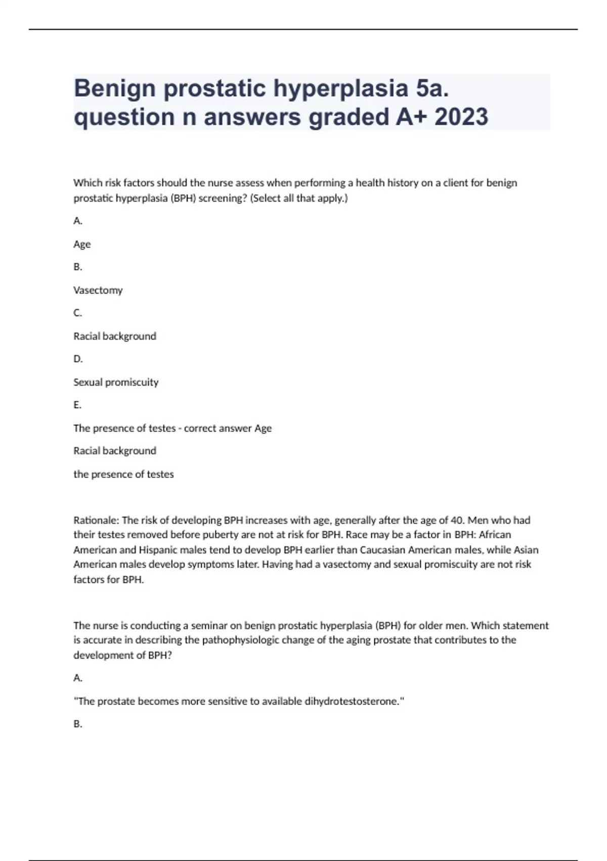 Benign prostatic hyperplasia 5a. question n answers graded A+ 2023Which risk factors should the nurse assess when performing a health history on a client for benign prostatic hyperplasia (BPH) screening? (Select all that apply.) A. Age B. Vasectomy C. Racial background D. Sexual promiscuity E. The presence of testes - correct answer Age Racial background the presence of testes Rationale: The risk of developing BPH increases with age, generally after the age of 40. Men who had their testes removed before puberty are not at risk for BPH. Race may be a factor in BPH: African American and Hispanic males tend to develop BPH earlier than Caucasian American males, while Asian American males develop symptoms later. Having had a vasectomy and sexual promiscuity are not risk factors for BPH. The nurse is conducting a seminar on benign prostatic hyperplasia (BPH) for older men. Which statement is accurate in describing the pathophysiologic change of the aging prostate that contributes to the development of BPH? A. "The prostate becomes more sensitive to available dihydrotestosterone." B. "Testosterone levels decrease, thereby decreasing inhibition of prostate growth." C. "Estrogen levels decrease, contributing to prostatic hyperplasia." D. "The prostate increases the production of dihydrotestosterone." - correct answer "The prostate becomes more sensitive to available dihydrotestosterone." Rationale: Dihydrotestosterone (DHT) mediates prostatic growth. Estrogen appears to sensitize the aging prostate to available DHT, ultimately contributing to prostatic hyperplasia. Increasing estrogen levels, not decreasing levels, contribute to prostatic hyperplasia. The prostate becomes more sensitive to DHT; DHT production is not increased. The statement concerning testosterone levels is not a valid statement. Which clinical manifestations should the nurse expect to observe when assessing a client with benign prostatic hyperplasia (BPH)? (Select all that apply.) A. Hesitancy B. Frequency C. Incontinence D. Incomplete emptying E. Weak or intermittent urinary stream - correct answer Hesitancy incomplete emptying weak of intermittent urinary stream Rationale: Symptoms of voiding BPH include hesitancy, incomplete emptying, weak or intermittent urinary stream, dribbling at the end of urination, and straining during urination. Frequency and incontinence are clinical manifestations of storage BPH, not benign BPH.