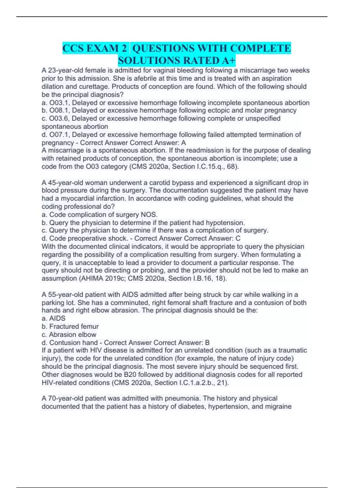 A 23-year-old female is admitted for vaginal bleeding following a miscarriage two weeks prior to this admission. She is afebrile at this time and is treated with an aspiration dilation and curettage. Products of conception are found. Which of the following should be the principal diagnosis? a. O03.1, Delayed or excessive hemorrhage following incomplete spontaneous abortion b. O08.1, Delayed or excessive hemorrhage following ectopic and molar pregnancy c. O03.6, Delayed or excessive hemorrhage following complete or unspecified spontaneous abortion d. O07.1, Delayed or excessive hemorrhage following failed attempted termination of pregnancy - Correct Answer Correct Answer: A A miscarriage is a spontaneous abortion. If the readmission is for the purpose of dealing with retained products of conception, the spontaneous abortion is incomplete; use a code from the O03 category (CMS 2020a, Section I.C.15.q., 68). A 45-year-old woman underwent a carotid bypass and experienced a significant drop in blood pressure during the surgery. The documentation suggested the patient may have had a myocardial infarction. In accordance with coding guidelines, what should the coding professional do? a. Code complication of surgery NOS. b. Query the physician to determine if the patient had hypotension. c. Query the physician to determine if there was a complication of surgery. d. Code preoperative shock. - Correct Answer Correct Answer: C With the documented clinical indicators, it would be appropriate to query the physician regarding the possibility of a complication resulting from surgery. When formulating a query, it is unacceptable to lead a provider to document a particular response. The query should not be directing or probing, and the provider should not be led to make an assumption (AHIMA 2019c; CMS 2020a, Section I.B.16, 18). A 55-year-old patient with AIDS admitted after being struck by car while walking in a parking lot. She has a comminuted, right femoral shaft fracture and a contusion of both hands and right elbow abrasion. The principal diagnosis should be the: a. AIDS b. Fractured femur c. Abrasion elbow d. Contusion hand - Correct Answer Correct Answer: B If a patient with HIV disease is admitted for an unrelated condition (such as a traumatic injury), the code for the unrelated condition (for example, the nature of injury code) should be the principal diagnosis. The most severe injury should be sequenced first. Other diagnoses would be B20 followed by additional diagnosis codes for all reported HIV-related conditions (CMS 2020a, Section I.C.1.a.2.b., 21). A 70-year-old patient was admitted with pneumonia. The history and physical documented that the patient has a history of diabetes, hypertension, and migraine