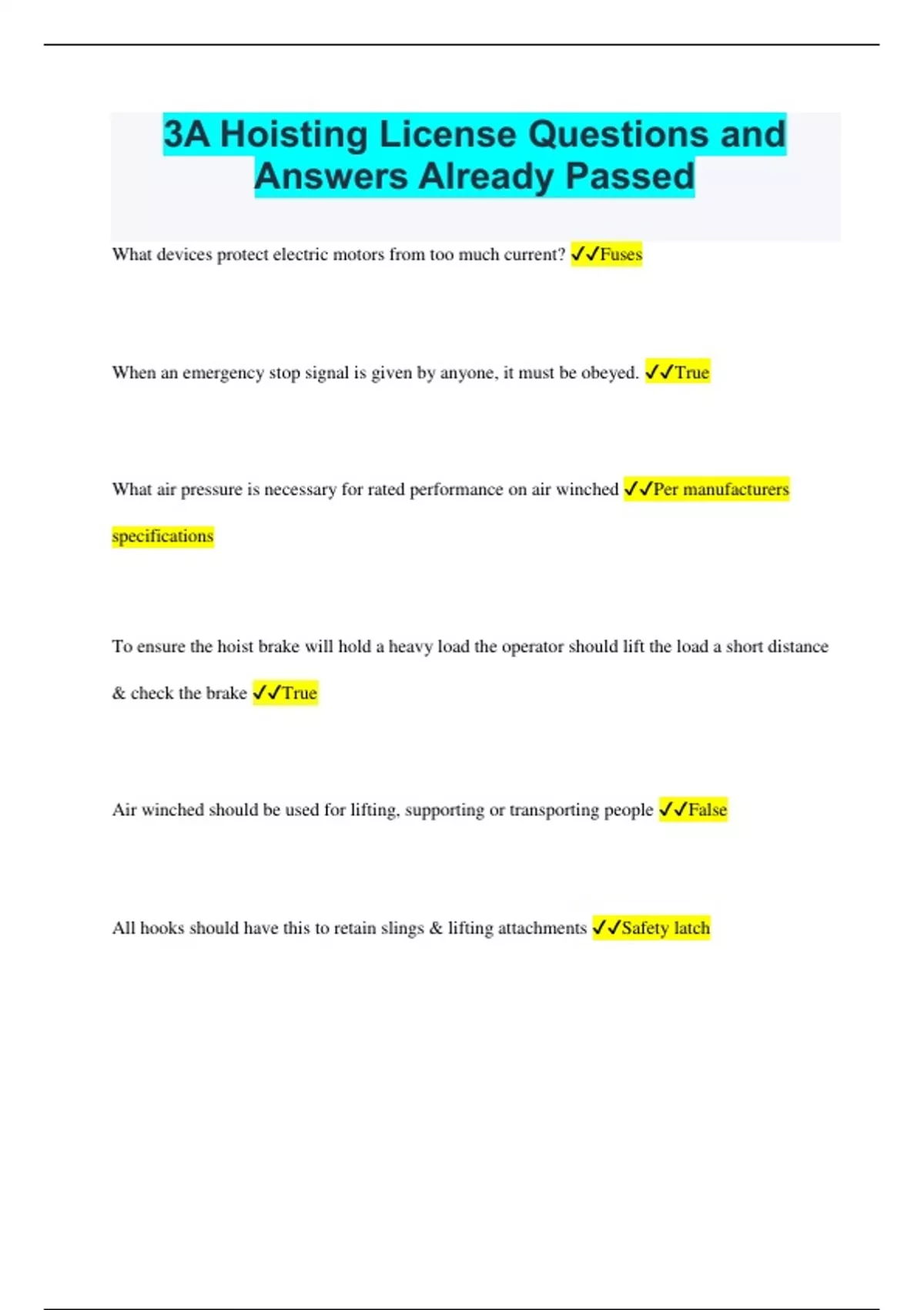 3A Hoisting License Questions and Answers Already Passed What devices protect electric motors from too much current? Fuses When an emergency stop signal is given by anyone, it must be obeyed. True What air pressure is necessary for rated performance on air winched Per manufacturers specifications To ensure the hoist brake will hold a heavy load the operator should lift the load a short distance & check the brake True Air winched should be used for lifting, supporting or transporting people False All hooks should have this to retain slings & lifting attachments Safety latch If you observe the direction of the block motion is not the same as called for by moving the controller to a "hoist" or "lower" position, what would you suspect my be the problem? The motor is wired incorrectly The hoist limit switch operation shall be checked when? Each shift Fracture of parts occurs more often during the warm summer months False What shall be attached to all load Hoisting equipment in clear view of the operator? The manufacturers load rating plate of load charts How is wire rope fastened to a drum? By wedges; U-bolts; clips & clamps Attachments can be welded to the hook if a small welding rod is used False If you are issued a Class 3A License you may operate all electric & air powered hoisting equipment except those, which may also require 1A License True When the rope is attached to a hook; ring or pulley block, what shall be placed in the loop or eye? A thimble Chain slings are allowed to be used in hoisting operations as long as they are in accordance with what 1926 Rules? OSHA The minimum drum diameter should be how many times the rope diameter? 18 In testing the hoist limit switch you? Slowly hoist the block to the limit switch just below the drum The safe working load of a hook is not reduced if the load is applied anywhere between the saddle & the tip of the hook False What are the minimum & maximum fleet angles? 1/4 to 2 degrees There is no safety hazard in lowering the block below