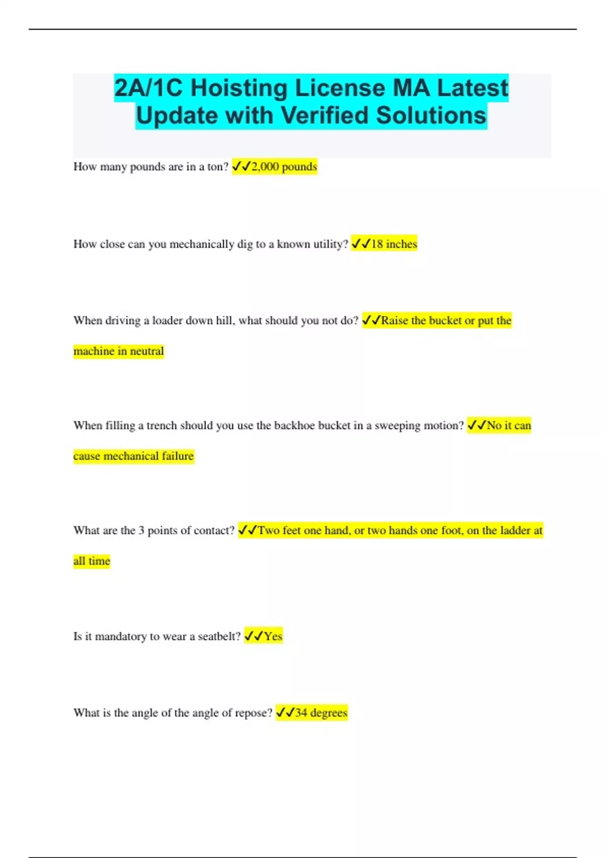 2A/1C Hoisting License MA Latest Update with Verified Solutions How many pounds are in a ton? 2,000 pounds How close can you mechanically dig to a known utility? 18 inches When driving a loader down hill, what should you not do? Raise the bucket or put the machine in neutral When filling a trench should you use the backhoe bucket in a sweeping motion? No it can cause mechanical failure What are the 3 points of contact? Two feet one hand, or two hands one foot, on the ladder at all time Is it mandatory to wear a seatbelt? Yes What is the angle of the angle of repose? 34 degrees How many cubic feet are in a cubic yard? 27 cubic feet What regulatory authority governs hoisting in Mass? 520 CMR 6.00 What does CMR stand for? Code of Massachusetts Regulation What chapter applies to Hoisting? Chapter 146 section 53-54A Digsafe Red Electric Digsafe Gas, Oil, Steam, is what color? yellow what color is used for communications for digsafe? orange ANSI stands for? American National Standards Institute ASME stands for? American Society of Mechanical Engineers The purpose of 520 CMR 600 is to? Establish rules and regulations for public safety. CFR stands for? Code of Federal Regulations The safest sling angle is? 60 or 90 degrees(whichever answer is on the test-it won't have both) or the closets to that(could be 59 or 63 degrees) When do hoisting licenses need to be renewed? every 2 years When can an excavator straddle a ditch? Never Pile of spoils should be placed how far back from the edge of a trench? Minimum of 2 feet Do you need a hoisting license on private property? Yes When is it allowed for a chain to be used in hoisting? Never
