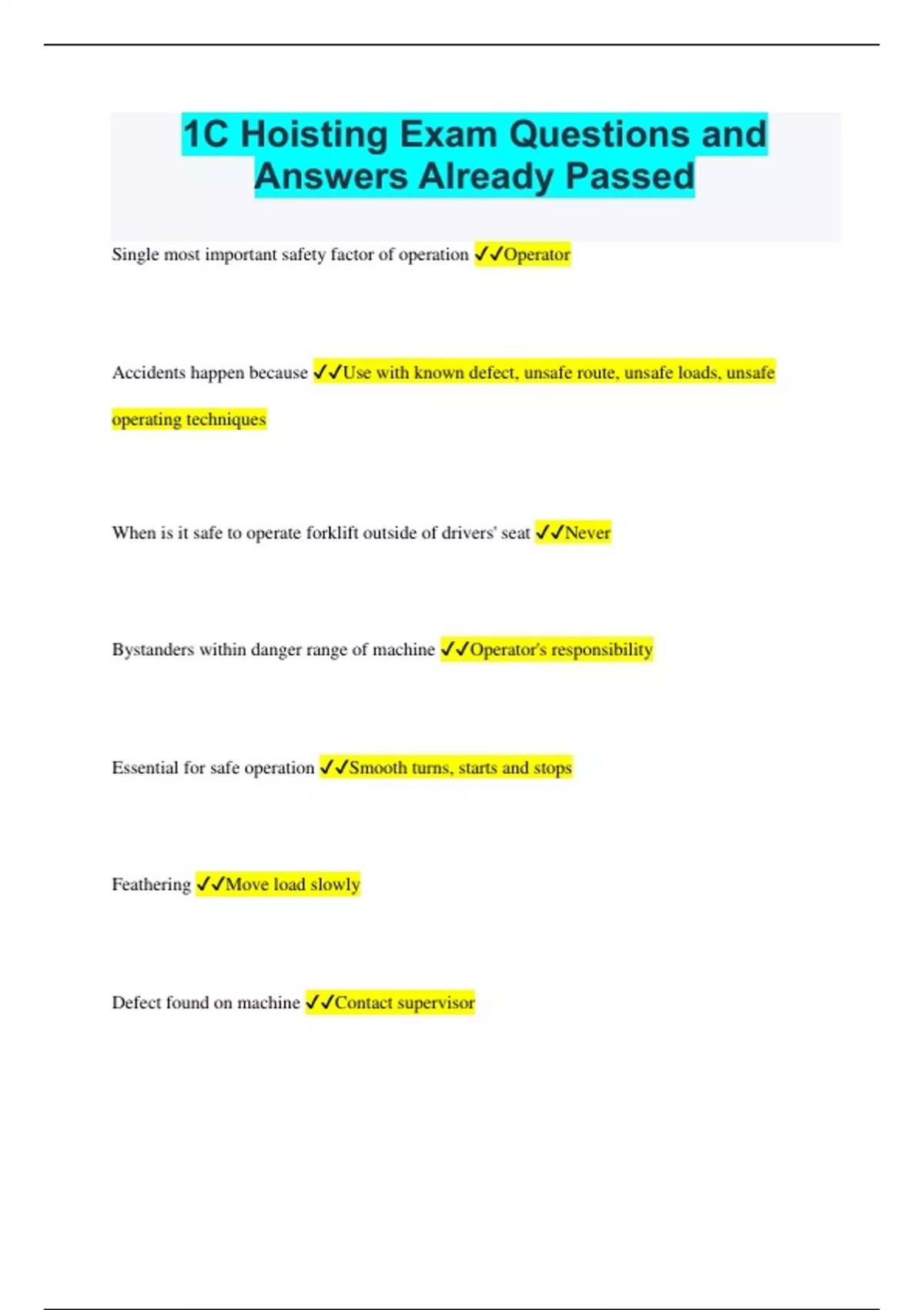1C Hoisting Exam Questions and Answers Already Passed Single most important safety factor of operation Operator Accidents happen because Use with known defect, unsafe route, unsafe loads, unsafe operating techniques When is it safe to operate forklift outside of drivers' seat Never Bystanders within danger range of machine Operator's responsibility Essential for safe operation Smooth turns, starts and stops Feathering Move load slowly Defect found on machine Contact supervisor Bystanders in danger zone with raised load Sound horn and ask them to move Pivot point of forklift Front axle Teeter totter Leverage Safe load limits on specific forklifts Should never be exceeded Forks pick up load Center of gravity moves forward Forward tipping happens when Center of gravity is on the opposite side of the front axle Momentum is created by Starting, stopping and turning Stability is affected by weight distribution, axle length, and wheel base Dangers increase as forklift is raised Tipping, loss of steering, momentum What force causes the forklift to tip forward when brakes are hit Momentum Center of gravity goes beyond stability area Tipping Forks in front Can't keep machine from tipping backwards Lift load straight up and down Mast Forklift Steering capacity for high speeds on highways Front wheels fixed, rear wheels steer Short turning radius at high speeds can overturn machine from Momentum When is it ok to carry riders during operation of machine Never When forklift tips forward You lose all