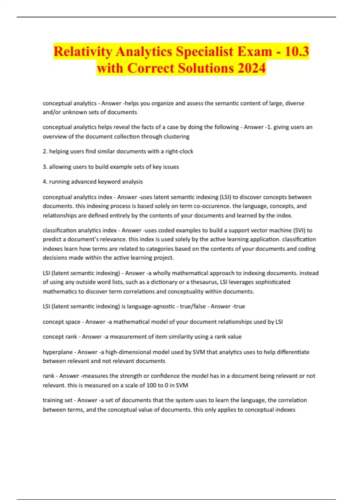 Relativity Analytics Specialist Exam - 10.3 with Correct Solutions 2024 conceptual analytics - Answer -helps you organize and assess the semantic content of large, diverse and/or unknown sets of documents conceptual analytics helps reveal the facts of a case by doing the following - Answer -1. giving users an overview of the document collection through clustering 2. helping users find similar documents with a right-clock 3. allowing users to build example sets of key issues 4. running advanced keyword analysis conceptual analytics index - Answer -uses latent semantic indexing (LSI) to discover concepts between documents. this indexing process is based solely on term co-occurence. the language, concepts, and relationships are defined entirely by the contents of your documents and learned by the index. classification analytics index - Answer -uses coded examples to build a support vector machine (SVI) to predict a document's relevance. this index is used solely by the active learning application. classification indexes learn how terms are related to categories based on the contents of your documents and coding decisions made within the active learning project.