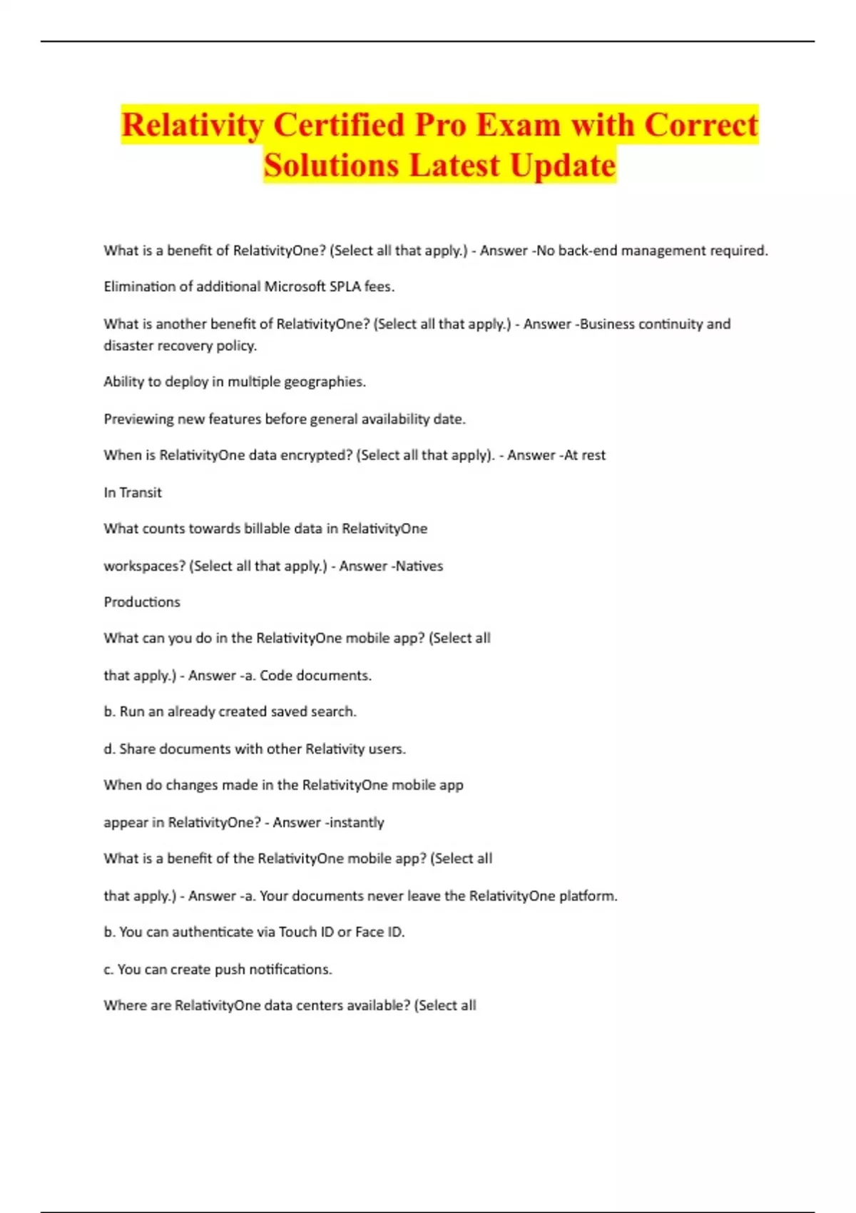 Relativity Certified Pro Exam with Correct Solutions Latest Update What is a benefit of RelativityOne? (Select all that apply.) - Answer -No back-end management required. Elimination of additional Microsoft SPLA fees. What is another benefit of RelativityOne? (Select all that apply.) - Answer -Business continuity and disaster recovery policy. Ability to deploy in multiple geographies. Previewing new features before general availability date. When is RelativityOne data encrypted? (Select all that apply). - Answer -At rest In Transit What counts towards billable data in RelativityOne workspaces? (Select all that apply.) - Answer -Natives Productions What can you do in the RelativityOne mobile app? (Select all that apply.) - Answer -a. Code documents. b. Run an already created saved search. d. Share documents with other Relativity users. When do changes made in the RelativityOne mobile app appear in RelativityOne? - Answer -instantly What is a benefit of the RelativityOne mobile app? (Select all that apply.) - Answer -a. Your documents never leave the RelativityOne platform. b. You can authenticate via Touch ID or Face ID. c. You can create push notifications. Where are RelativityOne data centers available? (Select all