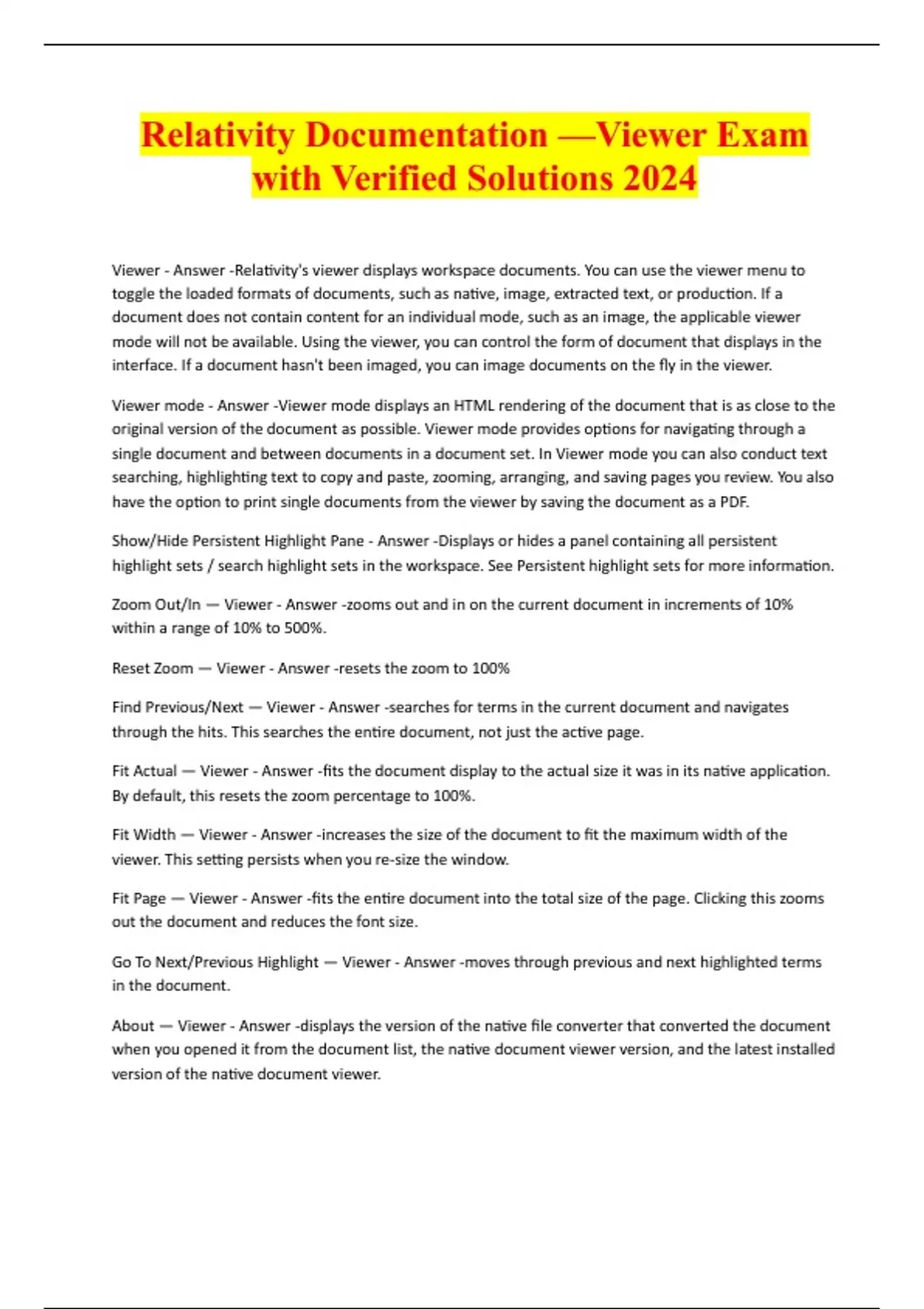 Relativity Documentation —Viewer Exam with Verified Solutions 2024 Viewer - Answer -Relativity's viewer displays workspace documents. You can use the viewer menu to toggle the loaded formats of documents, such as native, image, extracted text, or production. If a document does not contain content for an individual mode, such as an image, the applicable viewer mode will not be available. Using the viewer, you can control the form of document that displays in the interface. If a document hasn't been imaged, you can image documents on the fly in the viewer. Viewer mode - Answer -Viewer mode displays an HTML rendering of the document that is as close to the original version of the document as possible. Viewer mode provides options for navigating through a single document and between documents in a document set. In Viewer mode you can also conduct text searching, highlighting text to copy and paste, zooming, arranging, and saving pages you review. You also have the option to print single documents from the viewer by saving the document as a PDF. Show/Hide Persistent Highlight Pane - Answer -Displays or hides a panel containing all persistent highlight sets / search highlight sets in the workspace. See Persistent highlight sets for more information. Zoom Out/In — Viewer - Answer -zooms out and in on the current document in increments of 10% within a range of 10% to 500%. Reset Zoom — Viewer - Answer -resets the zoom to 100% Find Previous/Next — Viewer - Answer -searches for terms in the current document and navigates through the hits. This searches the entire document, not just the active page. Fit Actual — Viewer - Answer -fits the document display to the actual size it was in its native application. By default, this resets the zoom percentage to 100%. Fit Width — Viewer - Answer -increases the size of the document to fit the maximum width of the viewer. This setting persists when you re-size the window. Fit Page — Viewer - Answer -fits the entire document into the total size of the page. Clicking this zooms out the document and reduces the font size. Go To Next/Previous Highlight — Viewer - Answer -moves through previous and next highlighted terms in the document. About — Viewer - Answer -displays the version of the native file converter that converted the document when you opened it from the document list, the native document viewer version, and the latest installed version of the native document viewer.