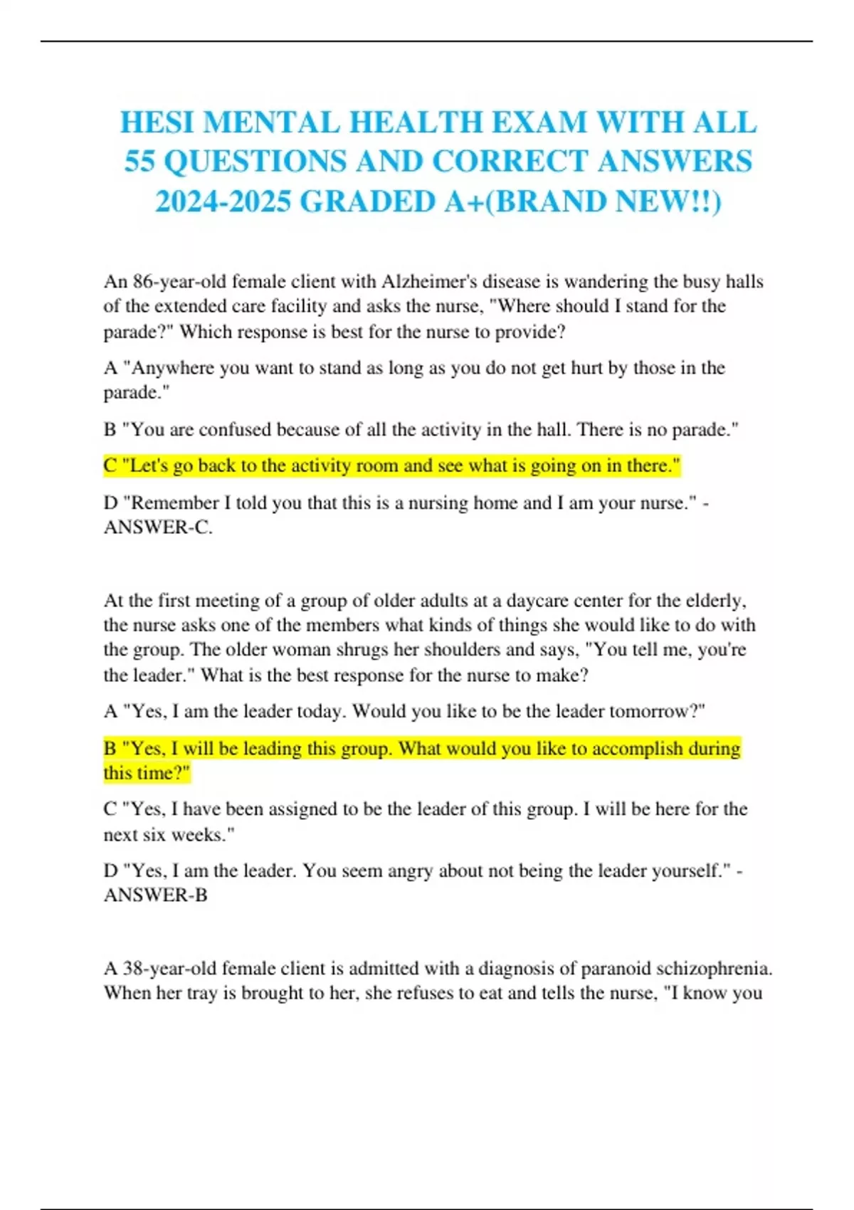 HESI MENTAL HEALTH EXAM WITH ALL 55 QUESTIONS AND CORRECT ANSWERS GRADED A+(BRAND NEW!!) An 86-year-old female client with Alzheimer's disease is wandering the busy halls of the extended care facility and asks the nurse, "Where should I stand for the parade?" Which response is best for the nurse to provide? A "Anywhere you want to stand as long as you do not get hurt by those in the parade." B "You are confused because of all the activity in the hall. There is no parade." C "Let's go back to the activity room and see what is going on in there." D "Remember I told you that this is a nursing home and I am your nurse." - ANSWER-C. At the first meeting of a group of older adults at a daycare center for the elderly, the nurse asks one of the members what kinds of things she would like to do with the group. The older woman shrugs her shoulders and says, "You tell me, you're the leader." What is the best response for the nurse to make? A "Yes, I am the leader today. Would you like to be the leader tomorrow?" B "Yes, I will be leading this group. What would you like to accomplish during this time?" C "Yes, I have been assigned to be the leader of this group. I will be here for the next six weeks."