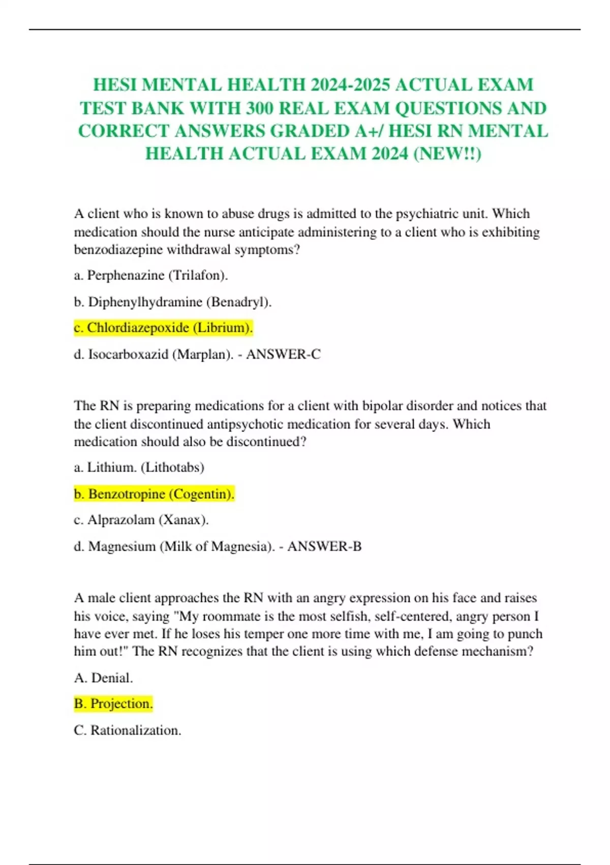 HESI MENTAL HEALTH ACTUAL EXAM TEST BANK WITH 300 REAL EXAM QUESTIONS AND CORRECT ANSWERS GRADED A+/ HESI RN MENTAL HEALTH ACTUAL EXAM 2024 (NEW!!)