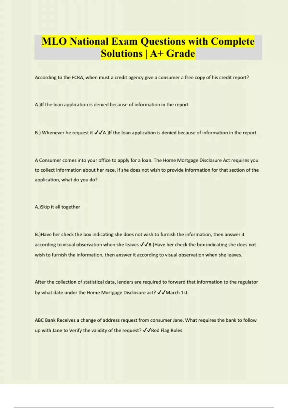 According to the FCRA, when must a credit agency give a consumer a free copy of his credit report? A.)If the loan application is denied because of information in the report B.) Whenever he request it A.)If the loan application is denied because of information in the report A Consumer comes into your office to apply for a loan. The Home Mortgage Disclosure Act requires you to collect information about her race. If she does not wish to provide information for that section of the application, what do you do? A.)Skip it all together B.)Have her check the box indicating she does not wish to furnish the information, then answer it according to visual observation when she leaves B.)Have her check the box indicating she does not wish to furnish the information, then answer it according to visual observation when she leaves. After the collection of statistical data, lenders are required to forward that information to the regulator by what date under the Home Mortgage Disclosure act? March 1st. ABC Bank Receives a change of address request from consumer Jane. What requires the bank to follow up with Jane to Verify the validity of the request? Red Flag RulesAccording to the Fair Credit Report Act, which situation does not entitle someone to a free copy of his credit report? An Applicant was refused credit due to insufficient income. Bob meets a loan origination at XYZ Mortgage Company to inquire about loan options. His name is on the National Do Not Call Registry. XYZ a.) Can call Bob for up to 3 months from the meeting date