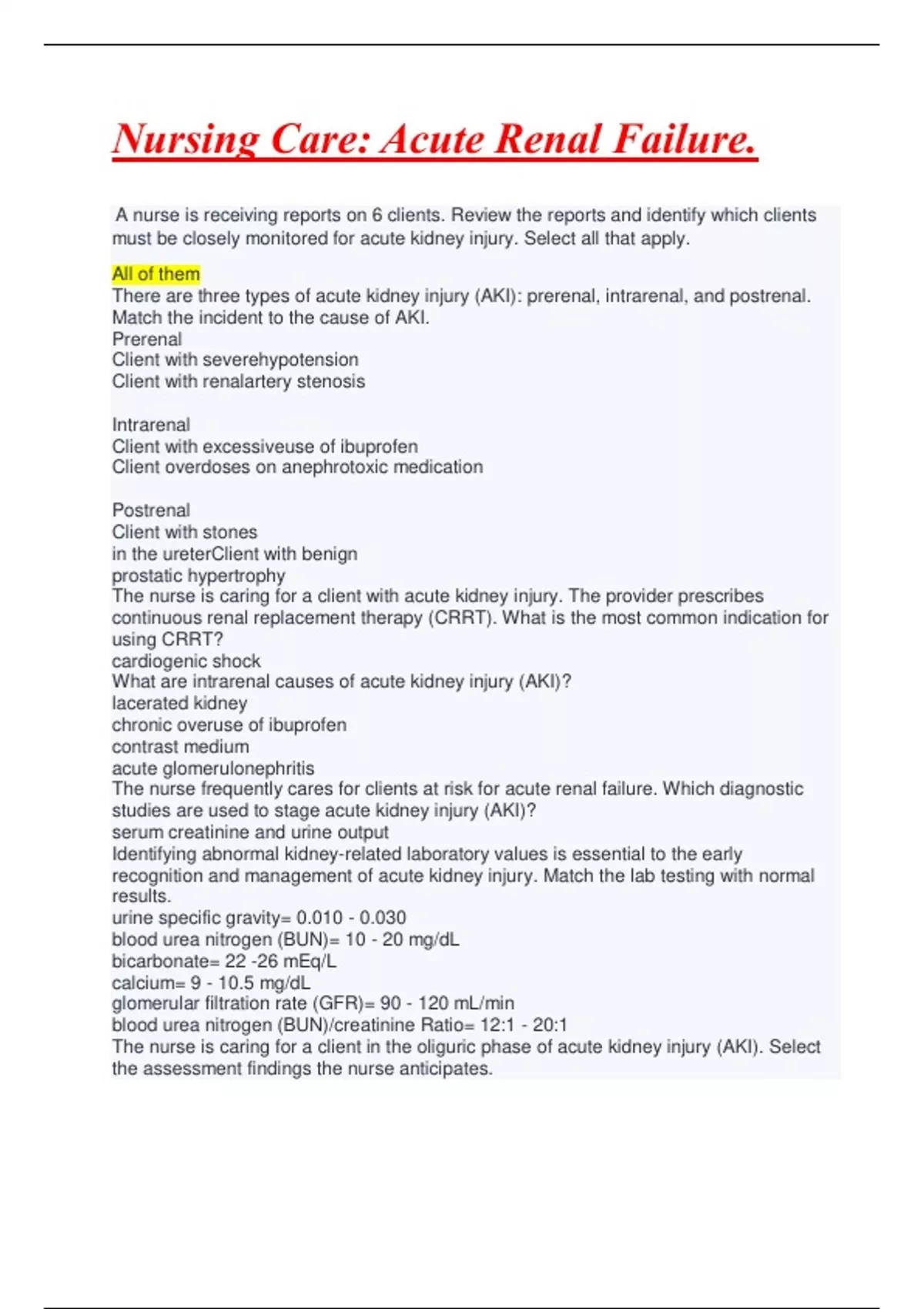 Postrenal Client with stones in the ureterClient with benign prostatic hypertrophy The nurse is caring for a client with acute kidney injury. The provider prescribes continuous renal replacement therapy (CRRT). What is the most common indication for using CRRT? cardiogenic shock What are intrarenal causes of acute kidney injury (AKI)? lacerated kidney chronic overuse of ibuprofen contrast medium acute glomerulonephritis The nurse frequently cares for clients at risk for acute renal failure. Which diagnostic studies are used to stage acute kidney injury (AKI)? serum creatinine and urine output Identifying abnormal kidney-related laboratory values is essential to the early recognition and management of acute kidney injury. Match the lab testing with normal results. urine specific gravity= 0.010 - 0.030 blood urea nitrogen (BUN)= 10 - 20 mg/dL bicarbonate= 22 -26 mEq/L calcium= 9 - 10.5 mg/dL glomerular filtration rate (GFR)= 90 - 120 mL/min blood urea nitrogen (BUN)/creatinine Ratio= 12:1 - 20:1 The nurse is caring for a client in the oliguric phase of acute kidney injury (AKI). Select the assessment findings the nurse anticipates.