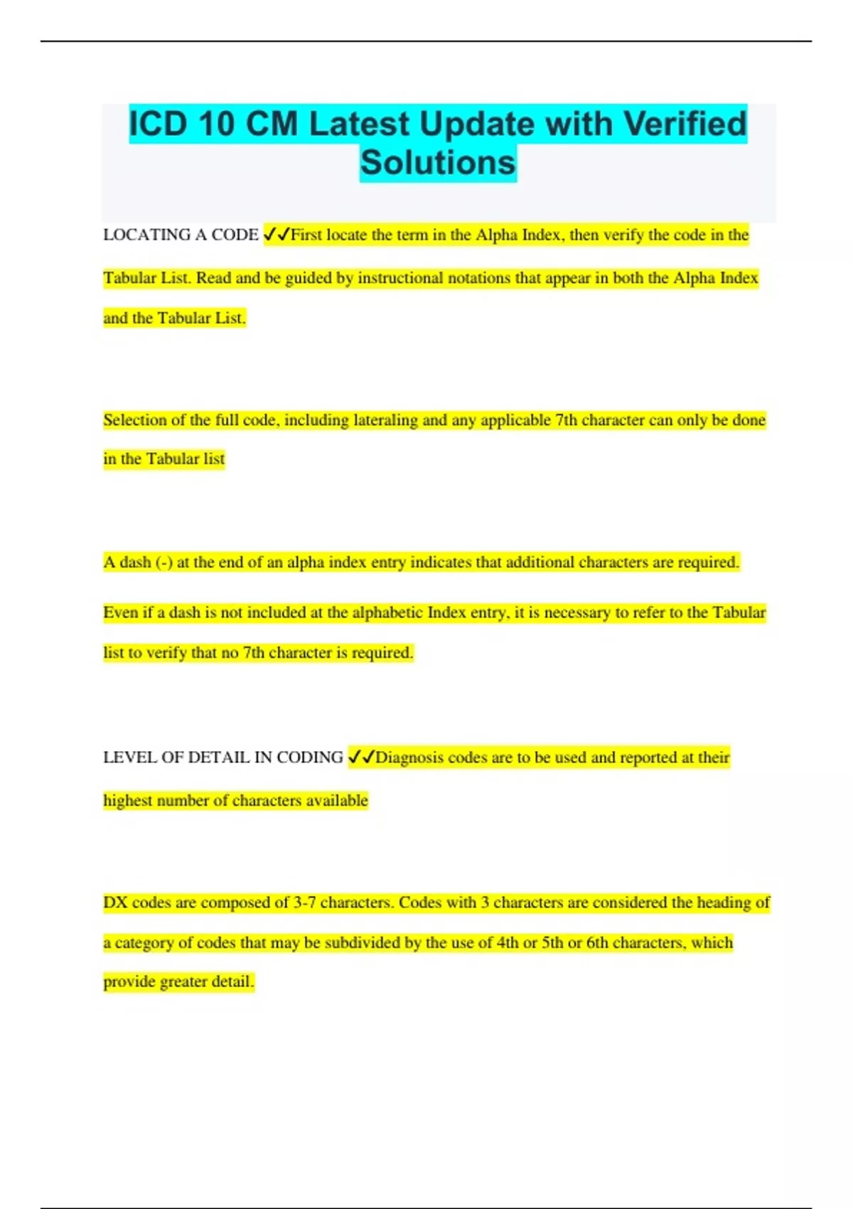 An Overview of ICD-10-CM Chapter 2 Questions and Answers Graded A+ The I-10 was originally issued in 1993 by ________ a) CMS b) AHIMA c) AHA d) WHO d) WHO This country is currently uses the ICD-10-AM: a) Argentina b) Africa c) Australia d) Austria c) Australia The I-10 is designed for the classification of patient __________ or _________. morbidity, mortality The CM in ICD-10-CM stands for ___________. clinical modification List four of the six reasons why diagnosis codes are used today. study health care costs, research the quality of health care, predict health care trends, and to facilitate payment for health services. The I-10 is used to translate what descriptive information into alphanumeric codes? verbal, narrative According to the "Expansion of injury codes" example box, what activity code would you reference for an injury on a trampoline? Y93.44 What activity is described by ICD-10 code: Y93.01? walking, marching, and hiking What activity is described by ICD-10 code: Y93.11? swimming What activity is described by ICD-10 code: Y93.34? bungee jumping When 00000 is displayed in the Flag field, the following is true about the target coding system: a) there are multiple entries available b) there is only a single entry available c) there is no code available d) any of the above may be true b) there is only a single entry available The third character in the Flag field is this type of flag: a) combination b) approximate c) scenario d) choice list a) combination According to figure 2-10, what is the code you would reference in the Tabular for: 1. aberrant basilar artery? 2. acute abdomen? 1. Q28.1