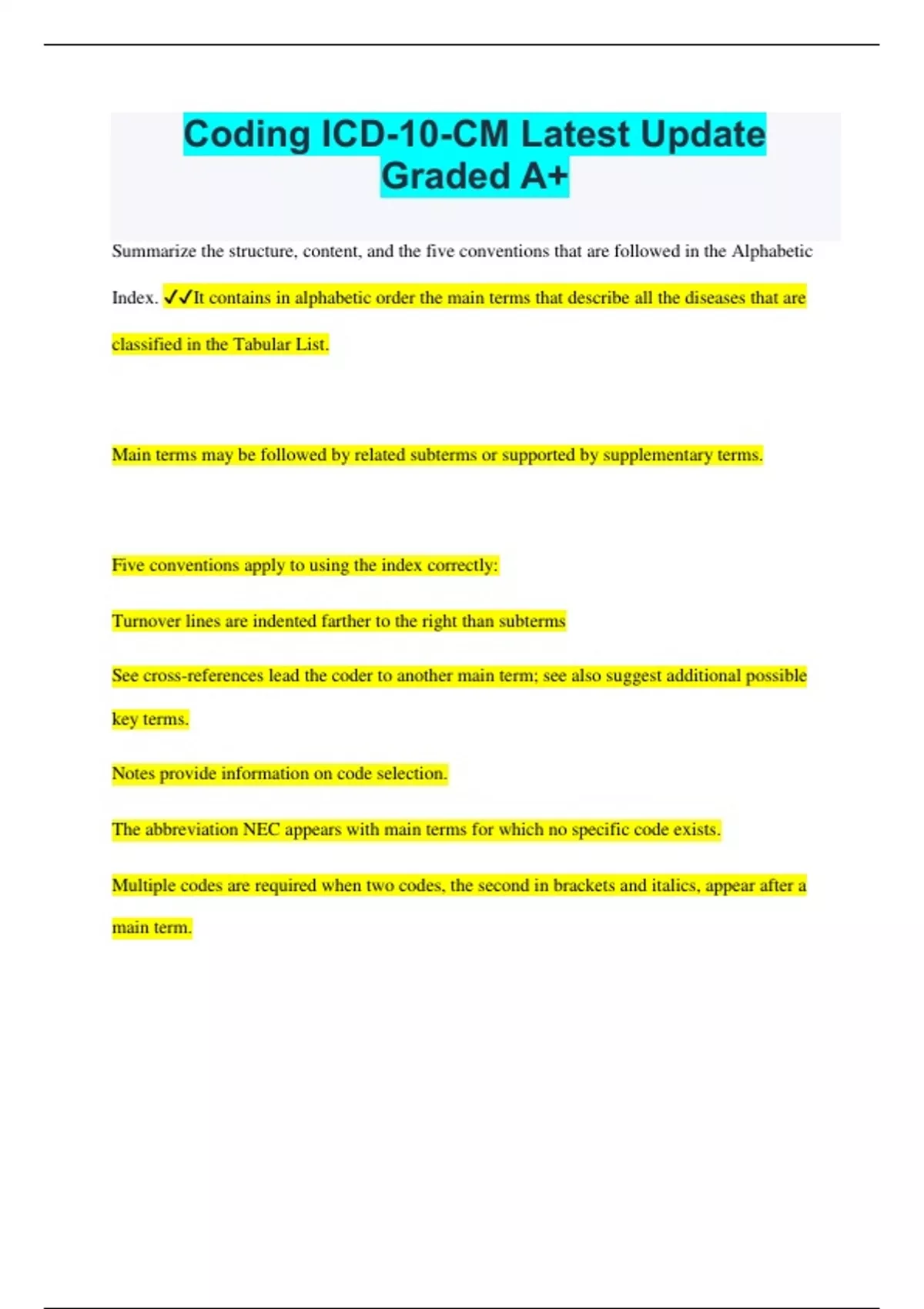Coding ICD-10-CM Latest Update Graded A+ Summarize the structure, content, and the five conventions that are followed in the Alphabetic Index. It contains in alphabetic order the main terms that describe all the diseases that are classified in the Tabular List. Main terms may be followed by related subterms or supported by supplementary terms. Five conventions apply to using the index correctly: Turnover lines are indented farther to the right than subterms See cross-references lead the coder to another main term; see also suggest additional possible key terms. Notes provide information on code selection. The abbreviation NEC appears with main terms for which no specific code exists. Multiple codes are required when two codes, the second in brackets and italics, appear after a main term. Summarize the structure, content, and the ten conventions that are followed in the Tabular List. It contains the codes, which are organized into seventeen chapters according to etiology or body system and are listed in numerical order. Code categories consist of three-digit groupings of a single disease's etiology, site, or manifestation. Further clinical detail is supplied by fifth-digit subclassifications. The ten conventions used in the Tabular List include: Fifth-digit requirement symbol Includes and excludes notes Colons in notes Parentheses around supplementary terms Brackets around supplementary synonyms, alternative wording, or explanations Braces to group-related terms Lozenge for non-WHO codes The abbreviation NOS to indicate the code to use when a condition is not completely described, and the abbreviation NEC for the code to be used when the diagnosis does not match any other available code Bullet (*) for new codes or entries, single triangle or facing triangle for new or revised descriptions. Phrases for multiple code requirements: Codes that are not used as primary appear in italics and are usually followed by an instruction to code first underlying disease or use an additional code. Recognize the chapters that make up the Tabular list. The 17 chapters are arranged by disease or condition, primarily structured by body system, and address a group of categories or codes. Identify the purpose and correct use of V codes and E codes. V codes: Identify encounters for reasons other than illness or injury Are used when healthy patients receive routine service, for therapeutic encounters, for a problem that is not currently affecting the patient's condition, and for preoperative evaluations. E Codes: Are never used as primary codes Classify the injuries resulting from various environmental