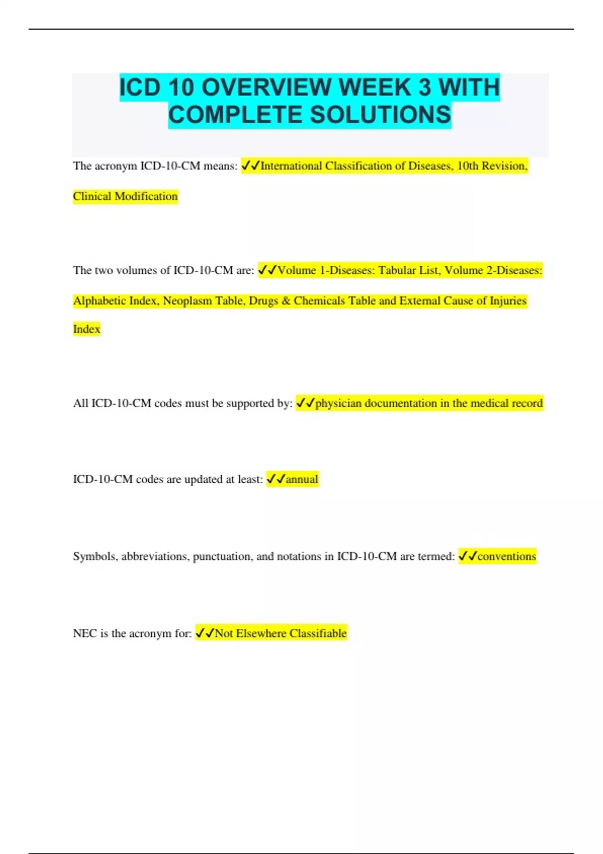 ICD 10 OVERVIEW WEEK 3 WITH COMPLETE SOLUTIONS The acronym ICD-10-CM means: International Classification of Diseases, 10th Revision, Clinical Modification The two volumes of ICD-10-CM are: Volume 1-Diseases: Tabular List, Volume 2-Diseases: Alphabetic Index, Neoplasm Table, Drugs & Chemicals Table and External Cause of Injuries Index All ICD-10-CM codes must be supported by: physician documentation in the medical record ICD-10-CM codes are updated at least: annual Symbols, abbreviations, punctuation, and notations in ICD-10-CM are termed: conventions NEC is the acronym for: Not Elsewhere Classifiable ICD-10-CM codes translate the ____ of services provided from verbal and narrative descriptions to nationally accepted reporting standards. Medical necessity NOS is the acronym for: Not Otherwise Specified The Table of Drugs and Chemicals is located in: Volume 2 Primary neoplasm The classification not included in the Table of Drugs and Chemicals is: ICD-10-CM codes are used for: Diagnostic Coding ICD-10 codes are alphanumeric, with all codes beginning with a number. False ICD-10 codes have a maximum of five characters. False Pertaining to ICD-10 codes, the letter N is assigned as a fifth character placeholder for certain six-character codes. False The ICD-10, the WHO version, does not include a procedure classification (ICD-10-PCS). True ICD-10-PCS is maintained and updated by: