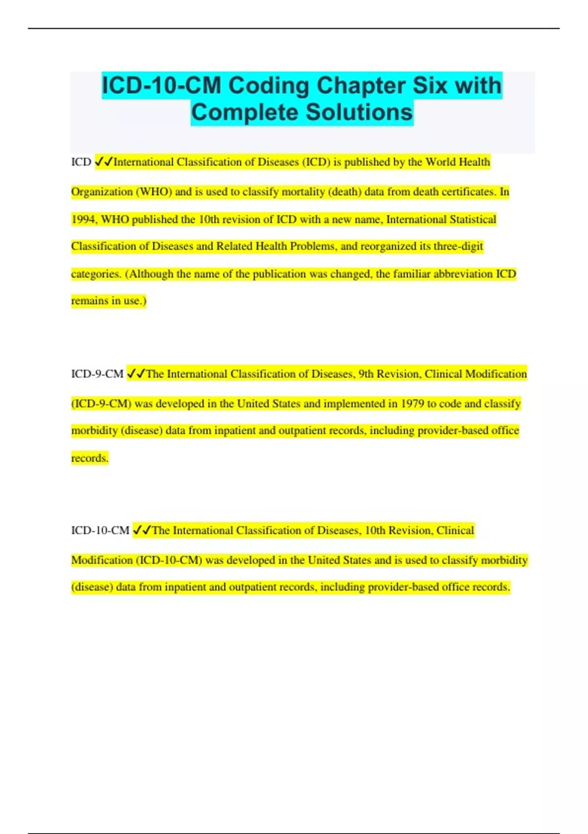 ICD-10-CM Coding Chapter Six with Complete Solutions ICD International Classification of Diseases (ICD) is published by the World Health Organization (WHO) and is used to classify mortality (death) data from death certificates. In 1994, WHO published the 10th revision of ICD with a new name, International Statistical Classification of Diseases and Related Health Problems, and reorganized its three-digit categories. (Although the name of the publication was changed, the familiar abbreviation ICD remains in use.) ICD-9-CM The International Classification of Diseases, 9th Revision, Clinical Modification (ICD-9-CM) was developed in the United States and implemented in 1979 to code and classify morbidity (disease) data from inpatient and outpatient records, including provider-based office records. ICD-10-CM The International Classification of Diseases, 10th Revision, Clinical Modification (ICD-10-CM) was developed in the United States and is used to classify morbidity (disease) data from inpatient and outpatient records, including provider-based office records. ICD-10-PCS The International Classification of Diseases, 10th Revision, Procedure Classification System (ICD-10-PCS) was developed in the United States and is used to code and classify procedures from inpatient records only. All provider offices, outpatient health care settings (e.g., home health care, hospice), and health care facilities (e.g., hospitals, long-term care facilities) report __________________ diagnosis codes. ICD-10-CM ICD-10-CM and ICD-10-PCS, also abbreviated as ICD-10-CM/PCS, replaced ______________ on October 1, 201 ICD-9-CM All provider-based offices and outpatient health care settings (including hospice and home health care) report _______ and _______ codes for procedures and services. This includes physicians, nurse practitioners, and physician assistants who provide services to inpatients during their hospitalization (e.g., initial hospital care, subsequent hospital care, surgical procedures). CPT; HCPCS level II Upon implementation of the ICD-10-CM (and ICD-10-PCS) coding systems, the International Classification of Diseases, 9th Revision, Clinical Modification (ICD- 9-CM) became a _______, which means it will be used to archive data but will no longer be supported or updated by the ICD- 9-CM Coordination and Maintenance Committee. legacy coding system (or legacy classification system) Because ICD-9-CM was used since 1979 in the United States to classify inpatient and outpatient/provider-based office diagnoses (Volumes 1 and 2) and inpatient procedures (Volume 3), _______ will be annually published by the National Center for Health Statistics (NCHS) and Centers for Medicare and Medicaid Services (CMS). general equivalence mappings (GEMs) The National Center for Health Statistics (NCHS) and Centers for Medicare and Medicaid Services (CMS) annually publish _______, which are translation dictionaries or crosswalks of codes that can be used to roughly identify ICD-10-CM codes for their ICD-9-CM equivalent codes (and vice versa). general equivalence mappings (GEMs) The format of ICD-10-CM is similar to ICD-9-CM Volumes 1 and 2 in that both coding systems use a(n) disease index to initially locate codes for conditions and a tabular list to verify codes. When coders have questions about documented diagnoses or procedures/ services, they should use a _______ to contact the responsible physician to request clarification about documentation and the code(s) to be assigned.. physician query process ICD-10-CM far exceeds ICD-9-CM in the number of codes provided, having been expanded to (1) _______, (2) _______, (3) _______. Assigning the sixth and seventh characters when available for ICD-10-CM codes is mandatory because they report information documented in the patient record. (1) include health-related conditions, (2) provide much greater specificity at the sixth digit level, and (3) add a seventh digit extension (for some codes) _______ is an entirely new procedure classification system that was developed by CMS for use in inpatient hospital settings only. ICD-10-PCS ICD-10-PCS uses a _______ that provides a unique code for all substantially different procedures. multiaxial seven-character alphanumeric code structure (e.g., 047K04Z) Some companies also publish _______, which automate the coding process. This means that computerized or web-based software (Figure 6-2) is used instead of coding manuals. encoders The National Center for Health Statistics (NCHS) and the Centers for Medicare and Medicaid Services (CMS) are the U.S. Department of Health and Human Services (DHHS) agencies that comprise the _______. ICD-10-CM/PCS Coordination and Maintenance Committee Automating the medical coding process is the goal of _______, which uses a natural language processing engine to "read" patient records and generate ICD-10-CM and HCPCS/CPT codes. computer-assisted coding (CAC) The Medicare Catastrophic Coverage Act of 1988 mandated the reporting of _______ diagnosis codes on Medicare claims. ICD-9-CM Effective October 1, 2015, ICD-10-CM and ICD-10-PCS replaced _______. ICD-9-CM Medicare defines medical necessity as _______. "the determination that a service or procedure rendered is reasonable and necessary for the diagnosis or treatment of an illness or injury." A(n) _______ is a face-to-face contact between a patient and a health care provider (e.g., physician, nurse practitioner) who assesses and treats the patient's condition. encounter The procedure or service is performed to treat