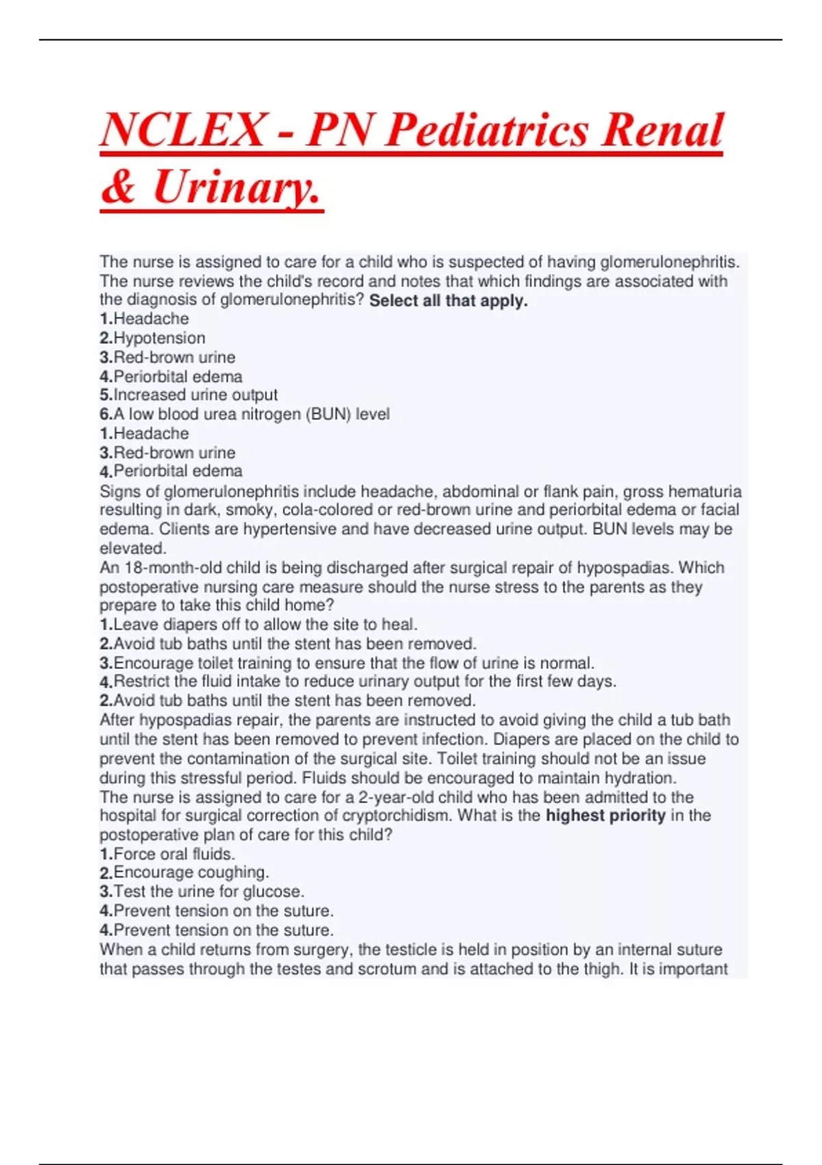 The nurse is assigned to care for a child who is suspected of having glomerulonephritis. The nurse reviews the child's record and notes that which findings are associated with the diagnosis of glomerulonephritis? Select all that apply. 1.Headache 2.Hypotension 3.Red-brown urine 4.Periorbital edema 5.Increased urine output 6.A low blood urea nitrogen (BUN) level 1.Headache 3.Red-brown urine 4.Periorbital edema Signs of glomerulonephritis include headache, abdominal or flank pain, gross hematuria resulting in dark, smoky, cola-colored or red-brown urine and periorbital edema or facial edema. Clients are hypertensive and have decreased urine output. BUN levels may be elevated. An 18-month-old child is being discharged after surgical repair of hypospadias. Which postoperative nursing care measure should the nurse stress to the parents as they prepare to take this child home? 1.Leave diapers off to allow the site to heal. 2.Avoid tub baths until the stent has been removed. 3.Encourage toilet training to ensure that the flow of urine is normal. 4.Restrict the fluid intake to reduce urinary output for the first few days. 2.Avoid tub baths until the stent has been removed. After hypospadias repair, the parents are instructed to avoid giving the child a tub bath until the stent has been removed to prevent infection. Diapers are placed on the child to prevent the contamination of the surgical site. Toilet training should not be an issue during this stressful period. Fluids should be encouraged to maintain hydration. The nurse is assigned to care for a 2-year-old child who has been admitted to the hospital for surgical correction of cryptorchidism. What is the highest priority in the postoperative plan of care for this child? 1.Force oral fluids. 2.Encourage coughing. 3.Test the urine for glucose. 4.Prevent tension on the suture. 4.Prevent tension on the suture. When a child returns from surgery, the testicle is held in position by an internal suture that passes through the testes and scrotum and is attached to the thigh. It is important