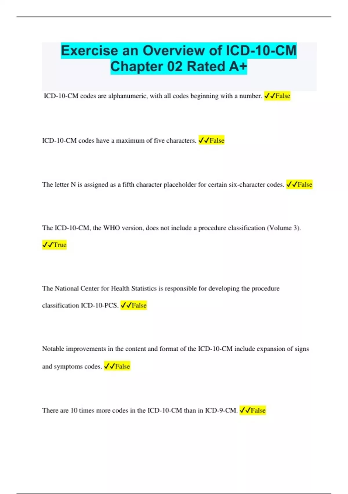 Exercise an Overview of ICD-10-CM Chapter 02 Rated A+ ICD-10-CM codes are alphanumeric, with all codes beginning with a number. False ICD-10-CM codes have a maximum of five characters. False The letter N is assigned as a fifth character placeholder for certain six-character codes. False The ICD-10-CM, the WHO version, does not include a procedure classification (Volume 3). True The National Center for Health Statistics is responsible for developing the procedure classification ICD-10-PCS. False Notable improvements in the content and format of the ICD-10-CM include expansion of signs and symptoms codes. False There are 10 times more codes in the ICD-10-CM than in ICD-9-CM. False All ICD-10-CM codes have seven characters. False The pre-release draft of the ICD-10-CM was released in June of 2003 and replaced with a revision in July of 2007. True There are 21 chapters in the ICD-10-CM. True This crosswalks ICD-9-CM codes to ICD-10-CM codes: GEMs Which of the following is true about the ICD-10-CM: There are combination diagnosis/symptom codes. The following are characteristics of the ICD-10-CM index: - Main terms are in bold type. - Subterms are indented under the main term. - Only the first four characters of some codes are given. (All of the above) Which organization has been responsible for the development of ICD-10-CM? NCHS The maximum number of characters in an ICD-10-CM code is: 7 Using the I-9 to I-10 GEMs file, map the following codes. 272.1 E78.1 Using the I-9 to I-10 GEMs file, map the following codes. 346.90 G43.909