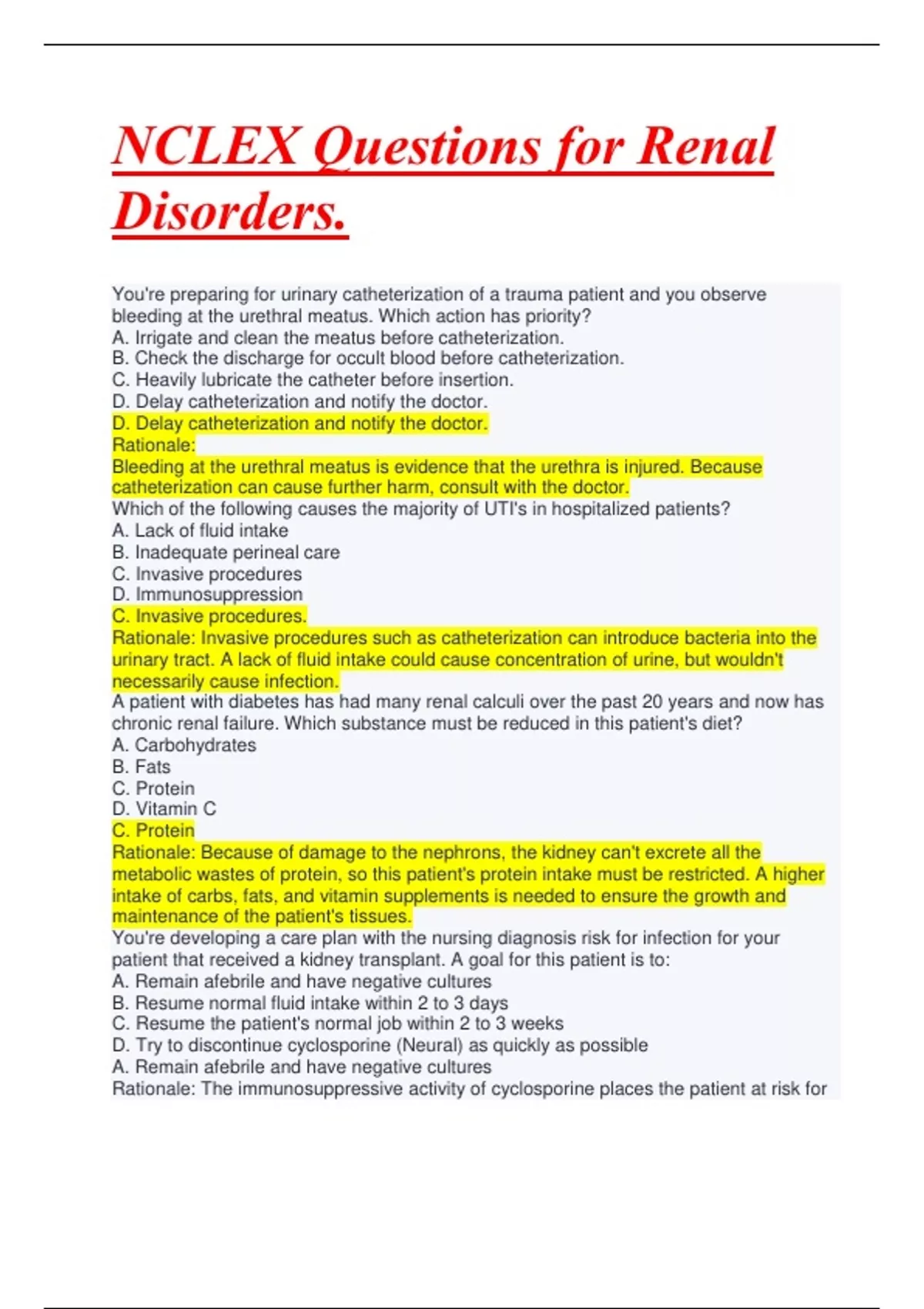 Which of the following causes the majority of UTI's in hospitalized patients? A. Lack of fluid intake B. Inadequate perineal care C. Invasive procedures D. Immunosuppression C. Invasive procedures. Rationale: Invasive procedures such as catheterization can introduce bacteria into the urinary tract. A lack of fluid intake could cause concentration of urine, but wouldn't necessarily cause infection. A patient with diabetes has had many renal calculi over the past 20 years and now has chronic renal failure. Which substance must be reduced in this patient's diet? A. Carbohydrates B. Fats C. Protein D. Vitamin C C. Protein Rationale: Because of damage to the nephrons, the kidney can't excrete all the metabolic wastes of protein, so this patient's protein intake must be restricted. A higher intake of carbs, fats, and vitamin supplements is needed to ensure the growth and maintenance of the patient's tissues. You're developing a care plan with the nursing diagnosis risk for infection for your patient that received a kidney transplant. A goal for this patient is to: A. Remain afebrile and have negative cultures B. Resume normal fluid intake within 2 to 3 days C. Resume the patient's normal job within 2 to 3 weeks D. Try to discontinue cyclosporine (Neural) as quickly as possible A. Remain afebrile and have negative cultures Rationale: The immunosuppressive activity of cyclosporine places the patient at risk fo