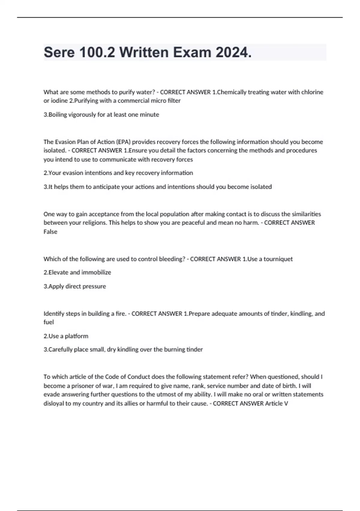 Sere 100.2 Written Exam 2024. What are some methods to purify water? - CORRECT ANSWER 1.Chemically treating water with chlorine or iodine 2.Purifying with a commercial micro filter 3.Boiling vigorously for at least one minute The Evasion Plan of Action (EPA) provides recovery forces the following information should you become isolated. - CORRECT ANSWER 1.Ensure you detail the factors concerning the methods and procedures you intend to use to communicate with recovery forces 2.Your evasion intentions and key recovery information 3.It helps them to anticipate your actions and intentions should you become isolated One way to gain acceptance from the local population after making contact is to discuss the similarities between your religions. This helps to show you are peaceful and mean no harm. - CORRECT ANSWER False Which of the following are used to control bleeding? - CORRECT ANSWER 1.Use a tourniquet 2.Elevate and immobilize 3.Apply direct pressure Identify steps in building a fire. - CORRECT ANSWER 1.Prepare adequate amounts of tinder, kindling, and fuel 2.Use a platform 3.Carefully place small, dry kindling over the burning tinder To which article of the Code of Conduct does the following statement refer? When questioned, should I become a prisoner of war, I am required to give name, rank, service number and date of birth. I will evade answering further questions to the utmost of my ability. I will make no oral or written statements disloyal to my country and its allies or harmful to their cause. - CORRECT ANSWER Article V
