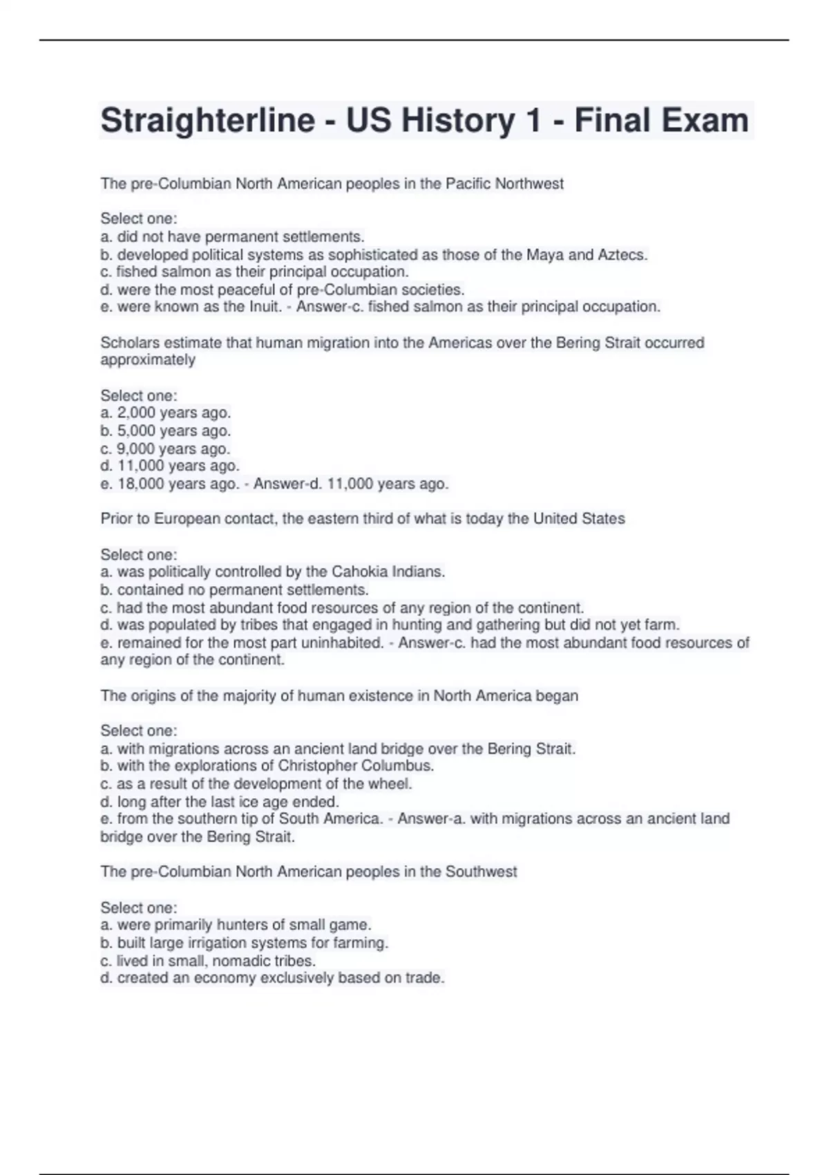 Straighterline - US History 1 - Final Exam The pre-Columbian North American peoples in the Pacific Northwest Select one: a. did not have permanent settlements. b. developed political systems as sophisticated as those of the Maya and Aztecs. c. fished salmon as their principal occupation. d. were the most peaceful of pre-Columbian societies. e. were known as the Inuit. - Answer-c. fished salmon as their principal occupation. Scholars estimate that human migration into the Americas over the Bering Strait occurred approximately Select one: a. 2,000 years ago. b. 5,000 years ago. c. 9,000 years ago. d. 11,000 years ago. e. 18,000 years ago. - Answer-d. 11,000 years ago. Prior to European contact, the eastern third of what is today the United States Select one: a. was politically controlled by the Cahokia Indians. b. contained no permanent settlements. c. had the most abundant food resources of any region of the continent. d. was populated by tribes that engaged in hunting and gathering but did not yet farm. e. remained for the most part uninhabited. - Answer-c. had the most abundant food resources of any region of the continent. The origins of the majority of human existence in North America began Select one: a. with migrations across an ancient land bridge over the Bering Strait. b. with the explorations of Christopher Columbus. c. as a result of the development of the wheel. d. long after the last ice age ended. e. from the southern tip of South America. - Answer-a. with migrations across an ancient land bridge over the Bering Strait. The pre-Columbian North American peoples in the Southwest Select one: a. were primarily hunters of small game. b. built large irrigation systems for farming. c. lived in small, nomadic tribes. d. created an economy exclusively based on trade.
