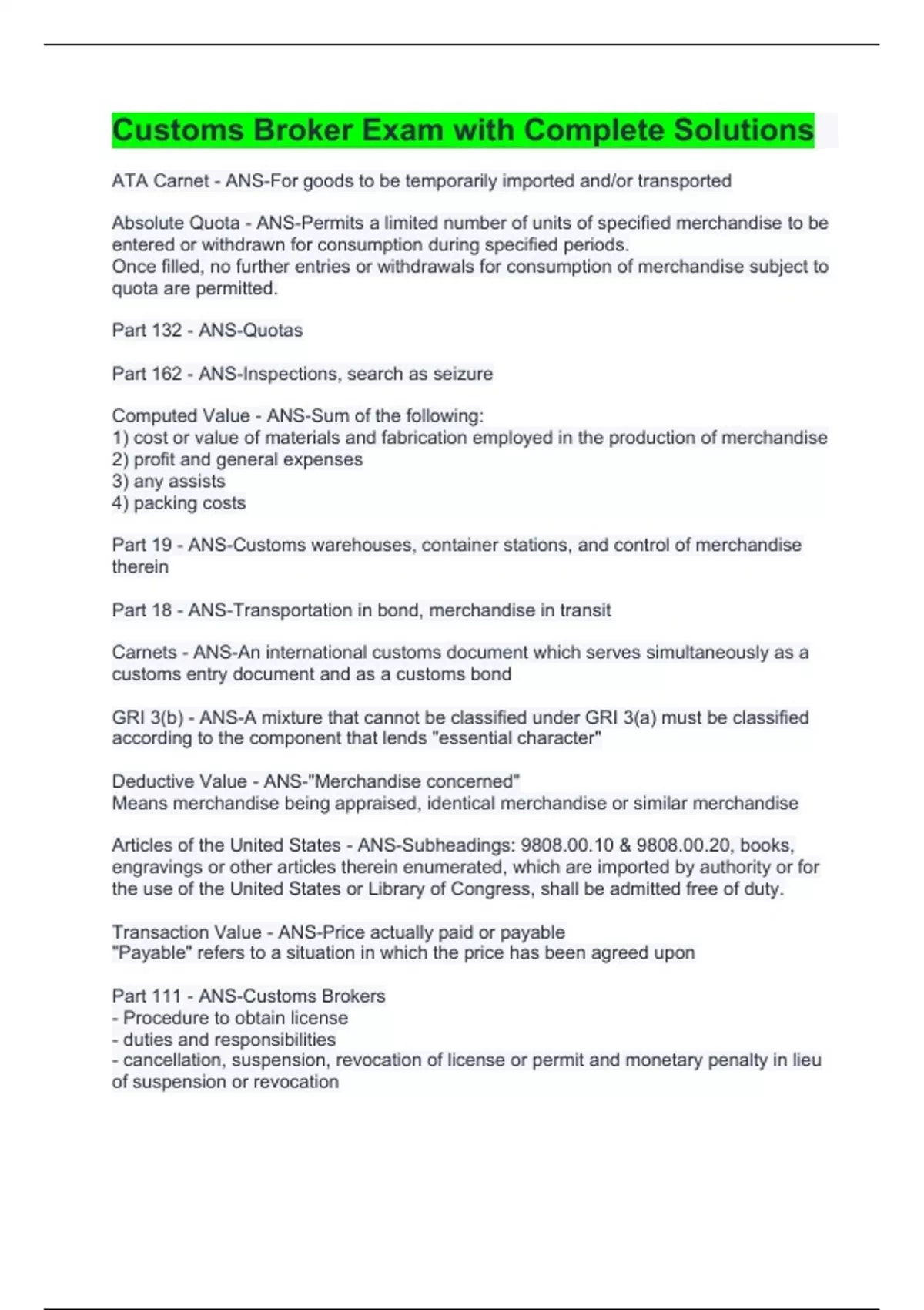 Customs Broker /CCS/Bahamas Customs Brokerage Exams Package Deal -Solved