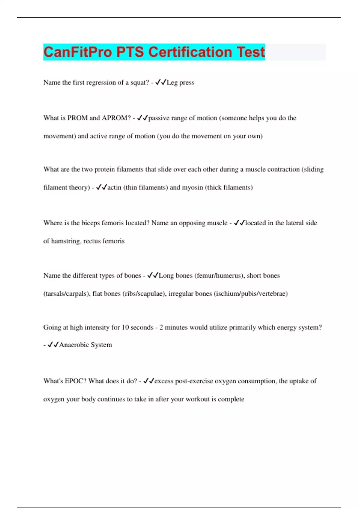 CanFitPro PTS Certification Test Name the first regression of a squat? - Leg press What is PROM and APROM? - passive range of motion (someone helps you do the movement) and active range of motion (you do the movement on your own) What are the two protein filaments that slide over each other during a muscle contraction (sliding filament theory) - actin (thin filaments) and myosin (thick filaments) Where is the biceps femoris located? Name an opposing muscle - located in the lateral side of hamstring, rectus femoris Name the different types of bones - Long bones (femur/humerus), short bones (tarsals/carpals), flat bones (ribs/scapulae), irregular bones (ischium/pubis/vertebrae) Going at high intensity for 10 seconds - 2 minutes would utilize primarily which energy system? - Anaerobic System What's EPOC? What does it do? - excess post-exercise oxygen consumption, the uptake of oxygen your body continues to take in after your workout is complete What is progressive overload? - to improve, clients must continually challenge their fitness. Gradually increasing the volume or intensity of the program to realize ongoing adaptions. Someone that isn't thinking of starting an exercise program is part of what stage of change? - Pre-contemplation After the first year of Personal Training, how much of your business should be coming from referrals? - 75% Name the two types of pain and the two types of injury - Mechanical pain (pain caused by mechanical movement) and systemic pain (result of disease/medical condition), acute injury and overuse injury What are the main synovial joints? - hinge (elbow/knee), condyloid (knuckles/wrist), ball and socket (shoulder/hips) Which muscles make up the cour four stretch sequence? - glutes, quadratus lumborum, hip flexors, latissimus dorsi What kind of postural distortions do we usually see with lower cross syndrome (lordosis)? - increased lumbar curve, forward sway of upper femur, depressed sternum, forward head posture, rounded shoulders Where does oxygenated blood go after it leaves the Left Atrium? - travels through the bicuspid valve into the left ventricle What bones make up the Axial skeleton? - skull, vertebral column and thorax What attaches muscle to bone? Bone to bone? - muscle to bone: tendon bone to bone: ligament What is Adduction/Abduction? - Adduction- moving toward the midline of body (medial movement)) Abduction- moving away from the midline of body (lateral movement) Name the agonist/antagonist for bicep curl, knee extension, calf raises, crunch Chest Press and Lat pulldown and their functions - bicep curl- bicep brachii, tricep brachii -elbow flexion knee extension- rectus femoris, bicep femoris -knee extension, flexion calf raises- gastrocnemius, tibialis anterior - plantar flexion, knee flexion crunch- rectus abdominis, erector spinae - spinal flexion chest press- pectoralis major, middle trapezius, latissimus dorsi, rhomboids -shoulder flexion, internal rotation, adduction lat pull down- latismuss dorsi, pectoralis major, middle deltoid -shoulder extension, shoulder adduction, internal rotation Name and explain all the exercise modifications from page 246 in your text - Speed of motion (tempo)- go faster or slower Range of motion- partial ROM/full ROM, angle specific adaptions Set performance- super sets, drop sets, modifies intensity, variety and time Stability- involves additional synergistic muscle groups Sensory perception- increases challenge by decreasing sensory feedback, eyes closed Recovery- reduce recovery time, increases intensity less ATP Reps- increase or decrease number of reps, results either endurance or strength Sets- increase number of sets, increases volume