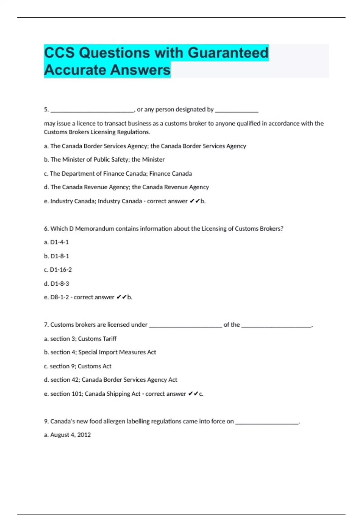 5. _________________________, or any person designated by _____________ may issue a licence to transact business as a customs broker to anyone qualified in accordance with the Customs Brokers Licensing Regulations. a. The Canada Border Services Agency; the Canada Border Services Agency b. The Minister of Public Safety; the Minister c. The Department of Finance Canada; Finance Canada d. The Canada Revenue Agency; the Canada Revenue Agency e. Industry Canada; Industry Canada - correct answer b. 6. Which D Memorandum contains information about the Licensing of Customs Brokers? a. D1-4-1 b. D1-8-1 c. D1-16-2 d. D1-8-3 e. D8-1-2 - correct answer b. 7. Customs brokers are licensed under ______________________ of the _____________________. a. section 3; Customs Tariff b. section 4; Special Import Measures Act c. section 9; Customs Act d. section 42; Canada Border Services Agency Act e. section 101; Canada Shipping Act - correct answer c. 9. Canada's new food allergen labelling regulations came into force on ___________________. a. August 4, 2012 b. November 5, 2013 c. July 30, 2012 d. April 19, 2013 e. June 29, 2012 - correct answer a. 10. There are five criteria that must be met for an individual to be granted a customs brokerage licence. Which of the following statements is not one of those criteria? a. An individual must be of good character. b. An individual must be at least 18 years of age. c. An individual must have a net income before taxes exceeding $200,000 in the most recent calendar year. d. An individual must have passed the Customs Brokers Professional Examination. e. An individual must be a citizen or permanent resident of Canada. - correct answer c. 11. To apply for a customs brokers' licence, application form ______ must be filed. a. A6 b. A8A-B