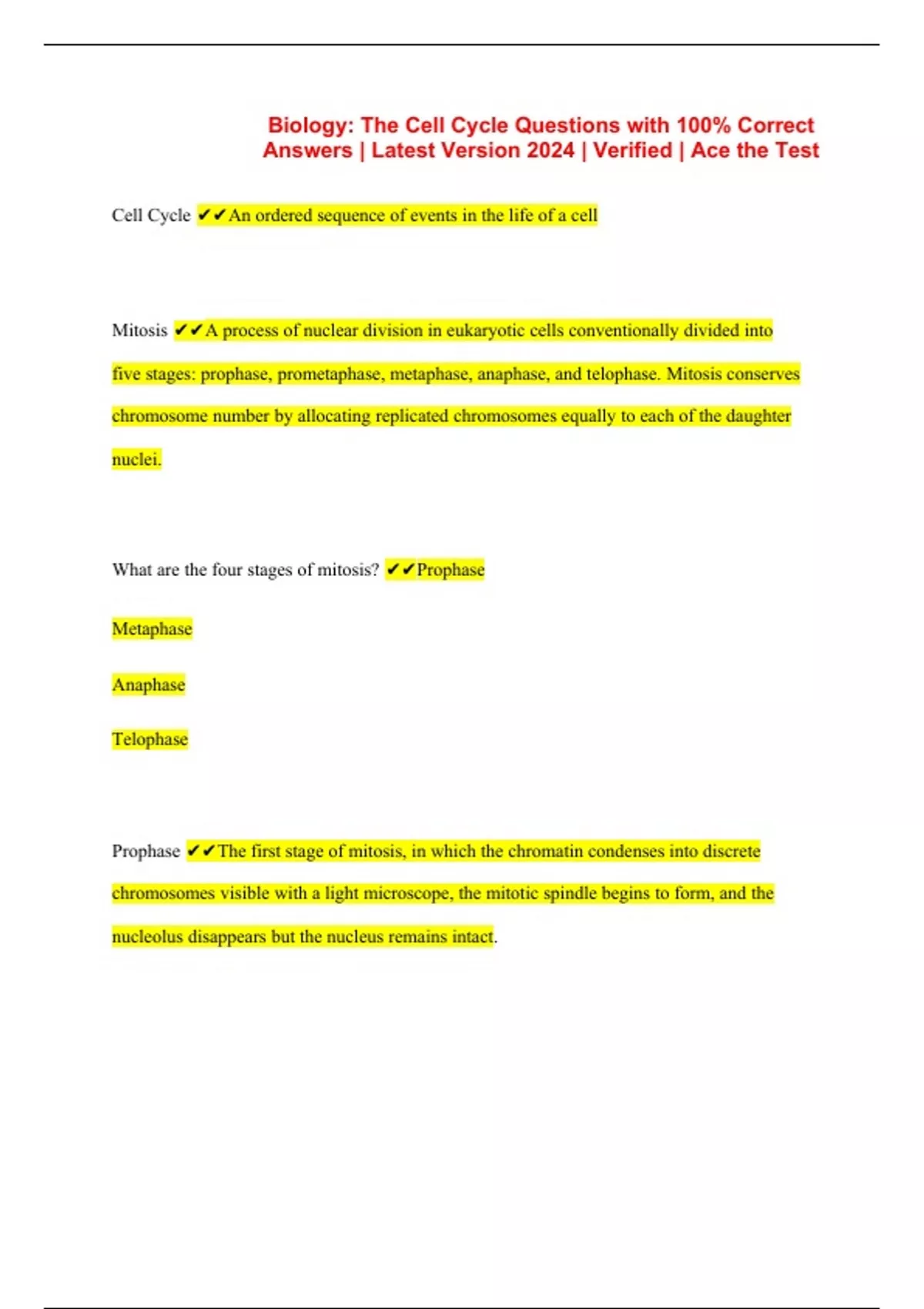 Biology: The Cell Cycle Questions with 100% Correct Answers | Latest Version 2024 | Verified | Ace the Test