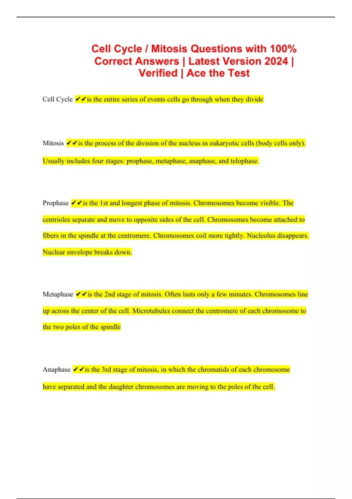 Cell Cycle / Mitosis Questions with 100% Correct Answers | Latest Version 2024 | Verified | Ace the Test