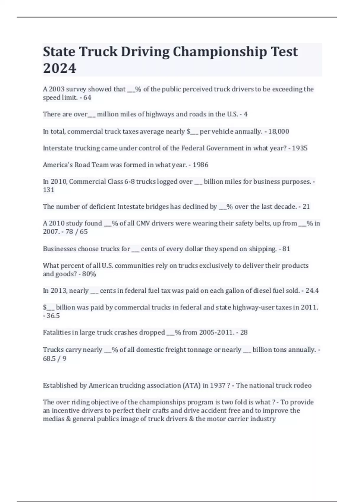State Truck Driving Championship Test 2024 A 2003 survey showed that ___% of the public perceived truck drivers to be exceeding the speed limit. - 64 There are over___ million miles of highways and roads in the U.S. - 4 In total, commercial truck taxes average nearly $___ per vehicle annually. - 18,000 Interstate trucking came under control of the Federal Government in what year? - 1935 America's Road Team was formed in what year. - 1986 In 2010, Commercial Class 6-8 trucks logged over ___ billion miles for business purposes. - 131 The number of deficient Intestate bridges has declined by ___% over the last decade. - 21 A 2010 study found ___% of all CMV drivers were wearing their safety belts, up from ___% in 2007. - 78 / 65 Businesses choose trucks for ___ cents of every dollar they spend on shipping. - 81 What percent of all U.S. communities rely on trucks exclusively to deliver their products and goods? - 80% In 2013, nearly ___ cents in federal fuel tax was paid on each gallon of diesel fuel sold. - 24.4 $___ billion was paid by commercial trucks in federal and state highway-user taxes in 2011. - 36.5 Fatalities in large truck crashes dropped ___% from . - 28 Trucks carry nearly ___% of all domestic freight tonnage or nearly ___ billion tons annually. - 68.5 / 9 Established by American trucking association (ATA) in 1937 ? - The national truck rodeo The over riding objective of the championships program is two fold is what ? - To provide an incentive drivers to perfect their crafts and drive accident free and to improve the medias & general publics image of truck drivers & the motor carrier industry Every driver must have a accident free record from the day - Immediately following the previous driving championship until and including the date of the current years championship
