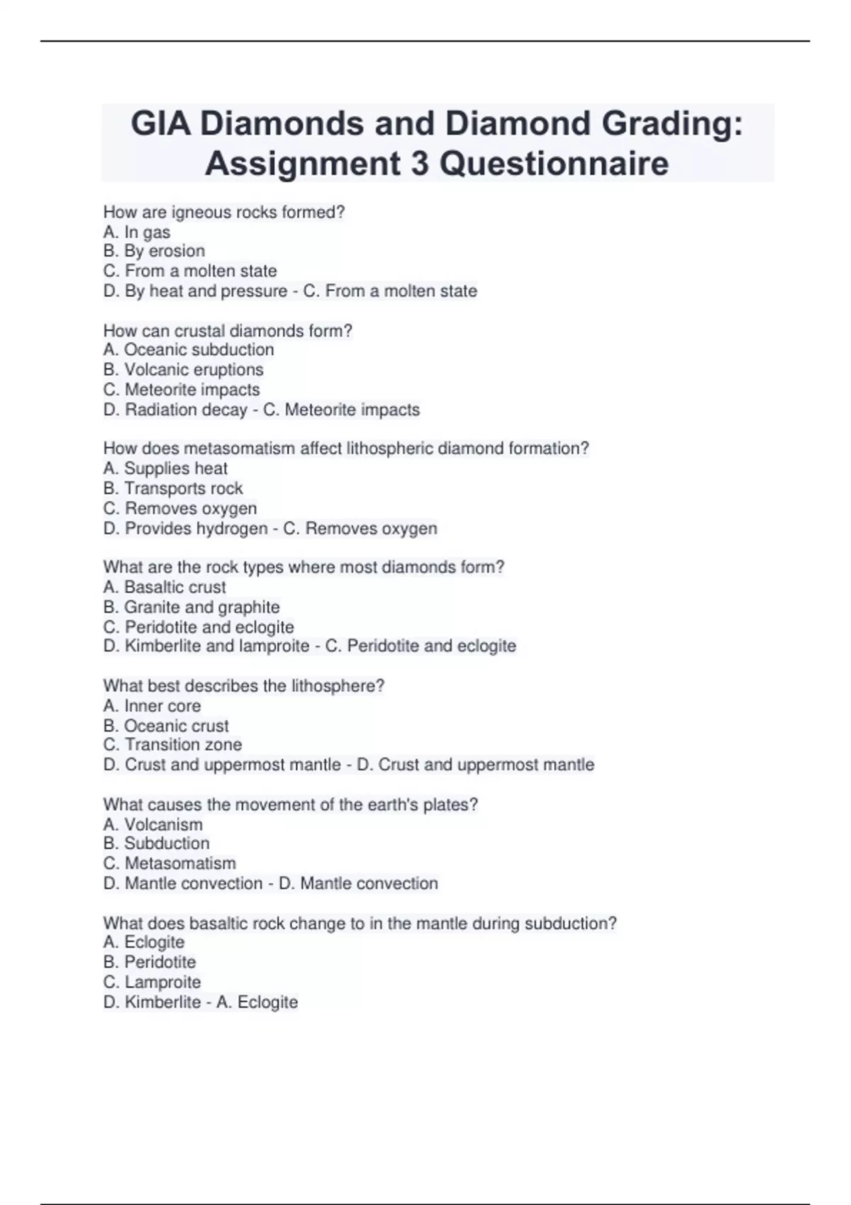 How are igneous rocks formed? A. In gas B. By erosion C. From a molten state D. By heat and pressure - C. From a molten state How can crustal diamonds form? A. Oceanic subduction B. Volcanic eruptions C. Meteorite impacts D. Radiation decay - C. Meteorite impacts How does metasomatism affect lithospheric diamond formation? A. Supplies heat B. Transports rock C. Removes oxygen D. Provides hydrogen - C. Removes oxygen What are the rock types where most diamonds form? A. Basaltic crust B. Granite and graphite C. Peridotite and eclogite D. Kimberlite and lamproite - C. Peridotite and eclogite What best describes the lithosphere? A. Inner core B. Oceanic crust C. Transition zone D. Crust and uppermost mantle - D. Crust and uppermost mantle What causes the movement of the earth's plates? A. Volcanism B. Subduction C. Metasomatism D. Mantle convection - D. Mantle convection What does basaltic rock chang