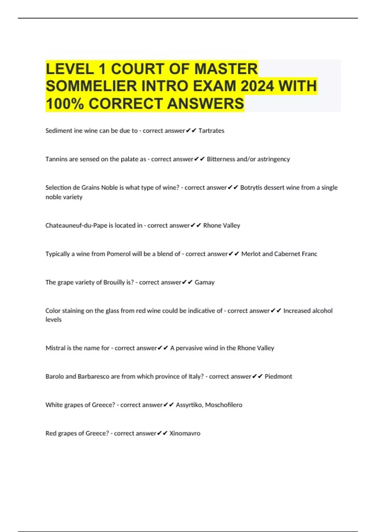 LEVEL 1 COURT OF MASTER SOMMELIER INTRO EXAM 2024 WITH 100% CORRECT ANSWERS Sediment ine wine can be due to - correct answer Tartrates Tannins are sensed on the palate as - correct answer Bitterness and/or astringency Selection de Grains Noble is what type of wine? - correct answer Botrytis dessert wine from a single noble variety Chateauneuf-du-Pape is located in - correct answer Rhone Valley Typically a wine from Pomerol will be a blend of - correct answer Merlot and Cabernet Franc The grape variety of Brouilly is? - correct answer Gamay Color staining on the glass from red wine could be indicative of - correct answer Increased alcohol levels Mistral is the name for - correct answer A pervasive wind in the Rhone Valley Barolo and Barbaresco are from which province of Italy? - correct answer Piedmont