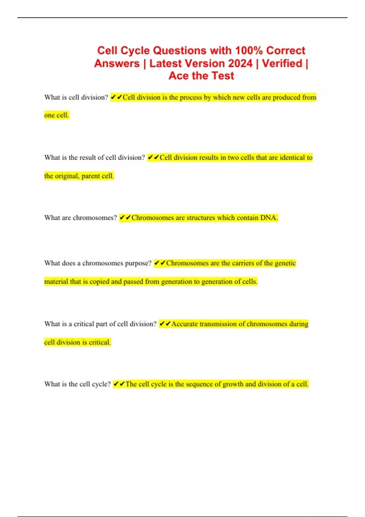 Cell Cycle Questions with 100% Correct Answers | Latest Version 2024 | Verified | Ace the Test