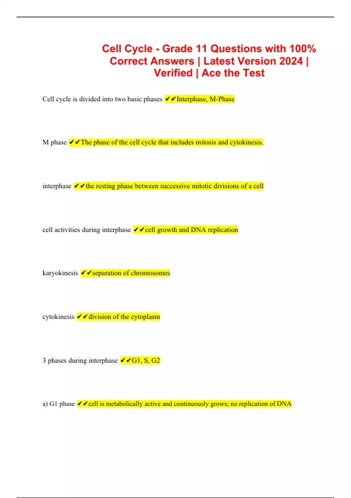 Cell Cycle - Grade 11 Questions with 100% Correct Answers | Latest Version 2024 | Verified | Ace the Test