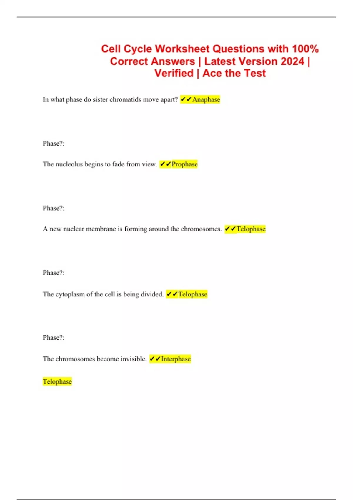 Cell Cycle Worksheet Questions with 100% Correct Answers | Latest Version 2024 | Verified | Ace the Test