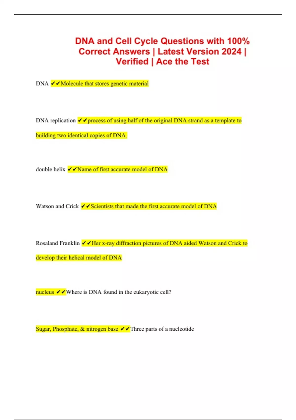 DNA and Cell Cycle Questions with 100% Correct Answers | Latest Version 2024 | Verified | Ace the Test