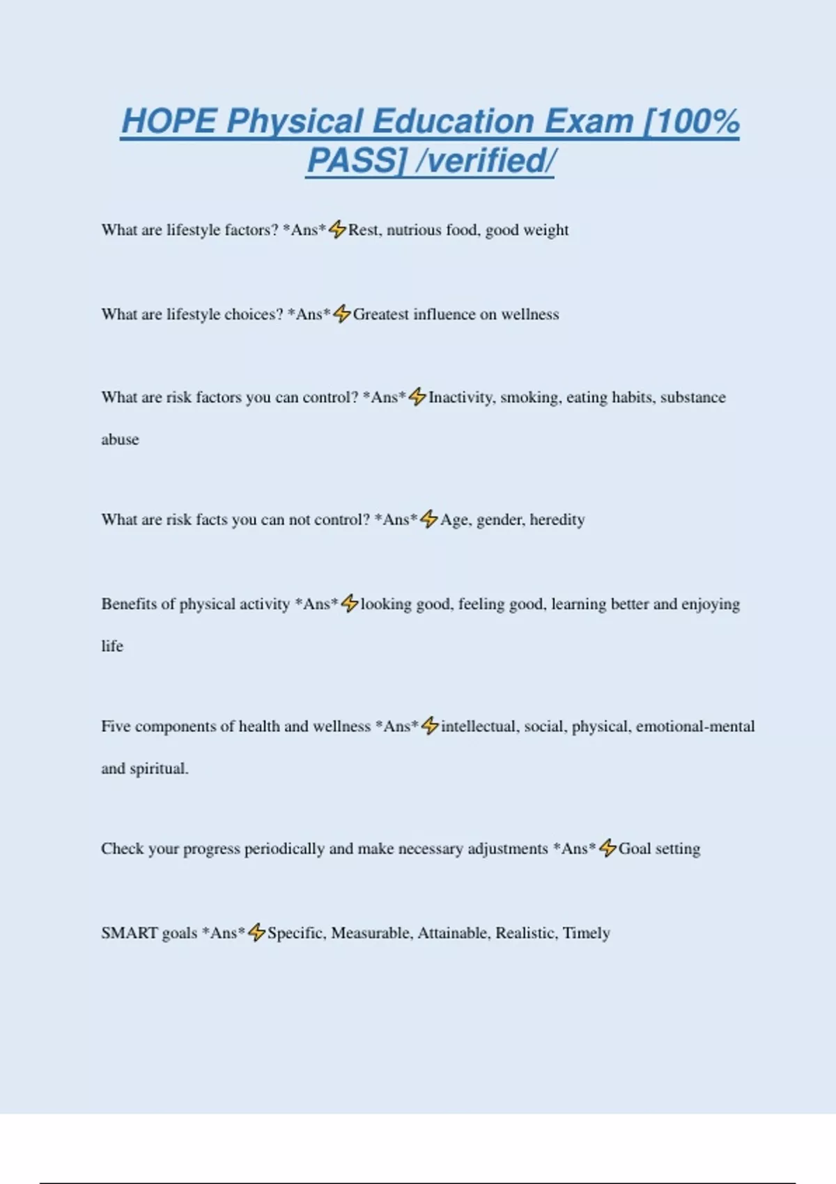 HOPE Physical Education Exam [100% PASS] /verified/ What are lifestyle factors? *Ans* Rest, nutrious food, good weight What are lifestyle choices? *Ans* Greatest influence on wellness What are risk factors you can control? *Ans* Inactivity, smoking, eating habits, substance abuse What are risk facts you can not control? *Ans* Age, gender, heredity Benefits of physical activity *Ans* looking good, feeling good, learning better and enjoying life Five components of health and wellness *Ans* intellectual, social, physical, emotional-mental and spiritual. Check your progress periodically and make necessary adjustments *Ans* Goal setting SMART goals *Ans* Specific, Measurable, Attainable, Realistic, Timely long term goal *Ans* Months or years short term goal *Ans* Days or weeks to accomplish Scientific Method *Ans* Identify a problem, establish a hypothesis, collect information, interpret information FITT formula *Ans* Frequency, Intensity, Time, Type Overload *Ans* working the body harder than it is normall