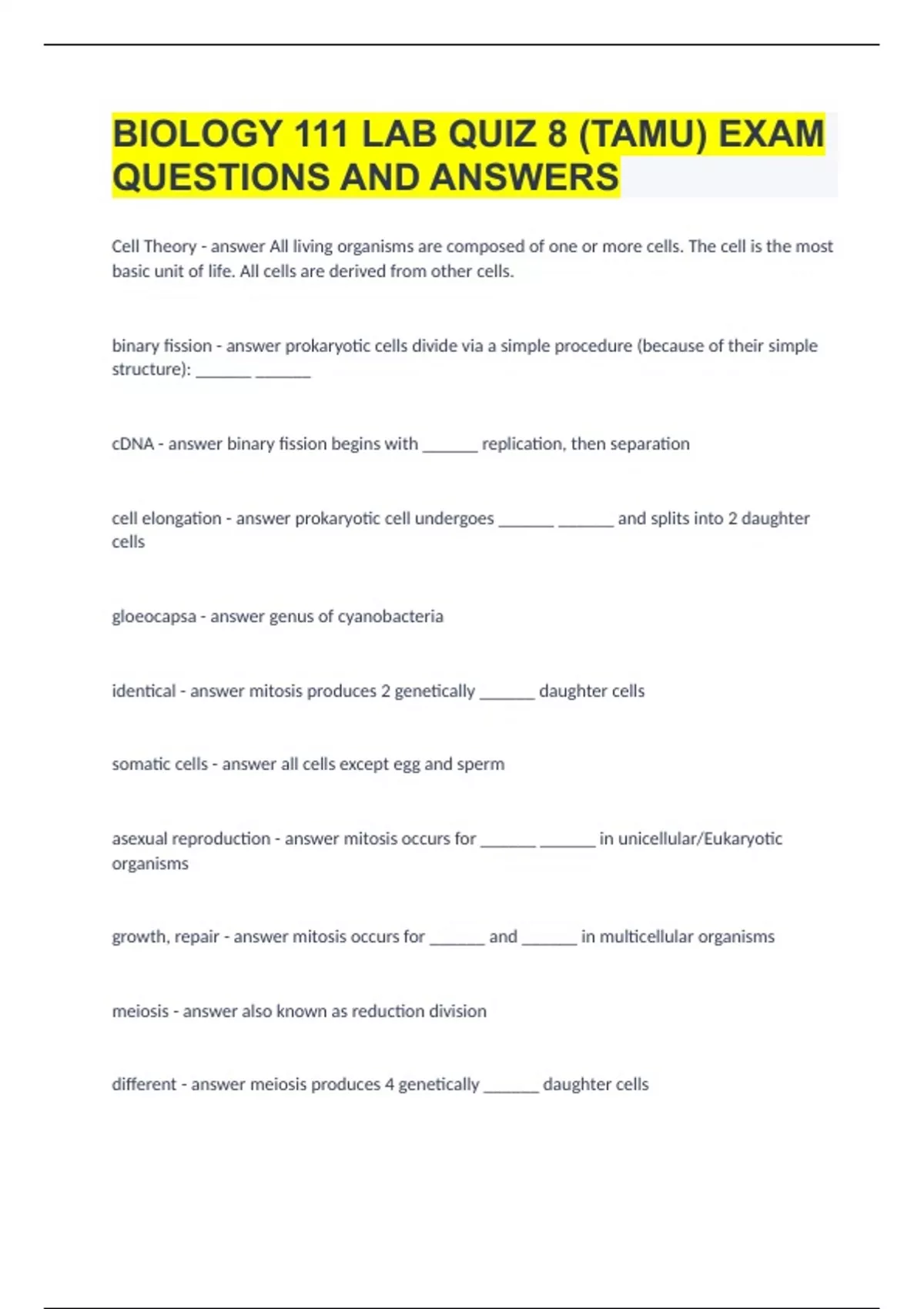 BIOLOGY 111 LAB QUIZ 8 (TAMU) EXAM QUESTIONS AND ANSWERS Cell Theory - answer All living organisms are composed of one or more cells. The cell is the most basic unit of life. All cells are derived from other cells. binary fission - answer prokaryotic cells divide via a simple procedure (because of their simple structure): ______ ______ cDNA - answer binary fission begins with ______ replication, then separation cell elongation - answer prokaryotic cell undergoes ______ ______ and splits into 2 daughter cells