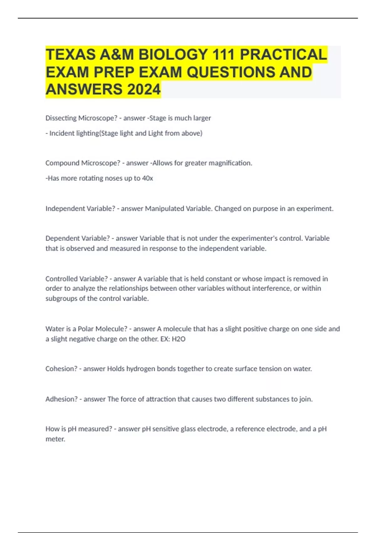 TEXAS A&M BIOLOGY 111 PRACTICAL EXAM PREP EXAM QUESTIONS AND ANSWERS 2024