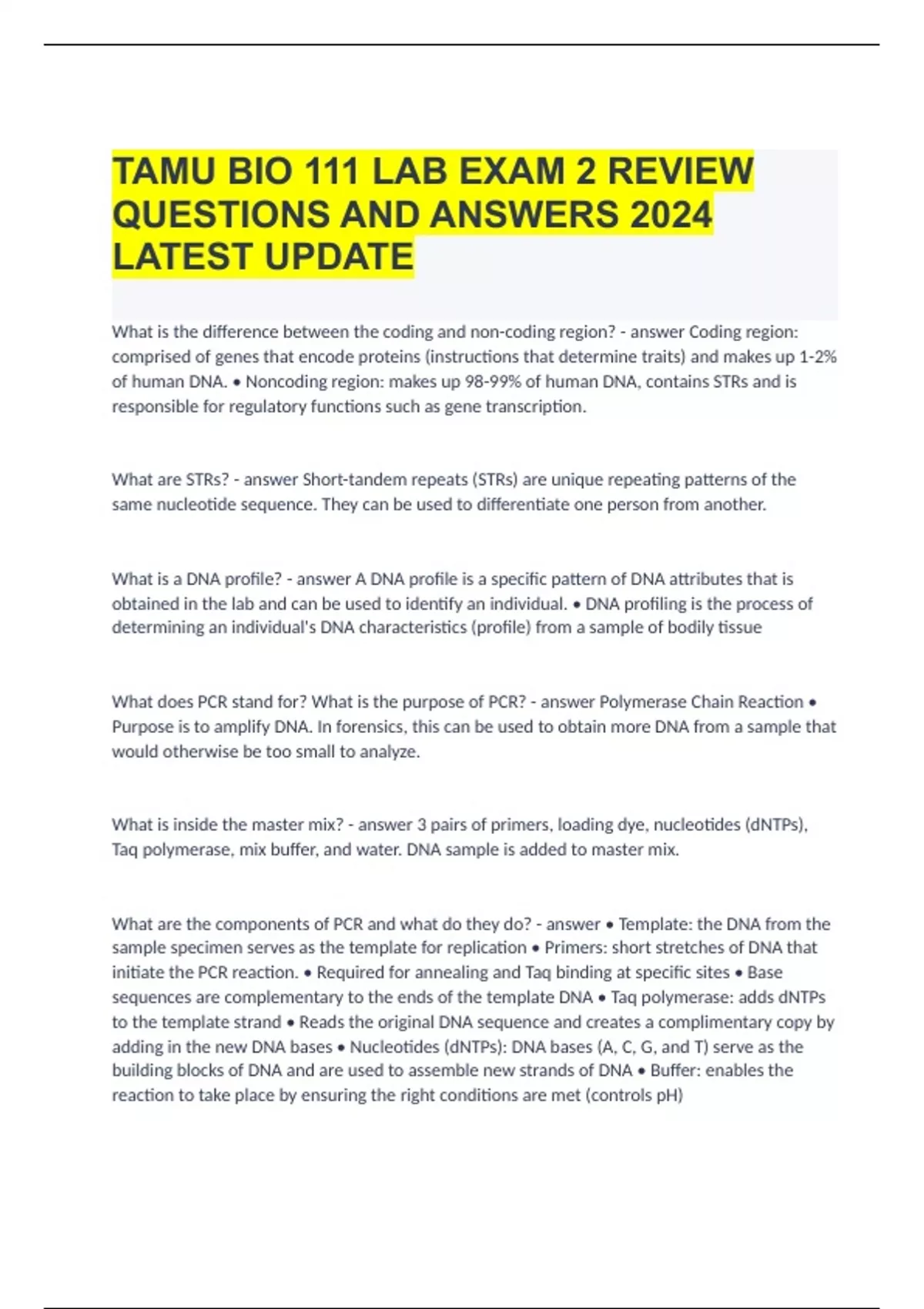 TAMU BIO 111 LAB EXAM 2 REVIEW QUESTIONS AND ANSWERS 2024 LATEST UPDATE What is the difference between the coding and non-coding region? - answer Coding region: comprised of genes that encode proteins (instructions that determine traits) and makes up 1-2% of human DNA. • Noncoding region: makes up 98-99% of human DNA, contains STRs and is responsible for regulatory functions such as gene transcription. What are STRs? - answer Short-tandem repeats (STRs) are unique repeating patterns of the same nucleotide sequence. They can be used to differentiate one person from another.