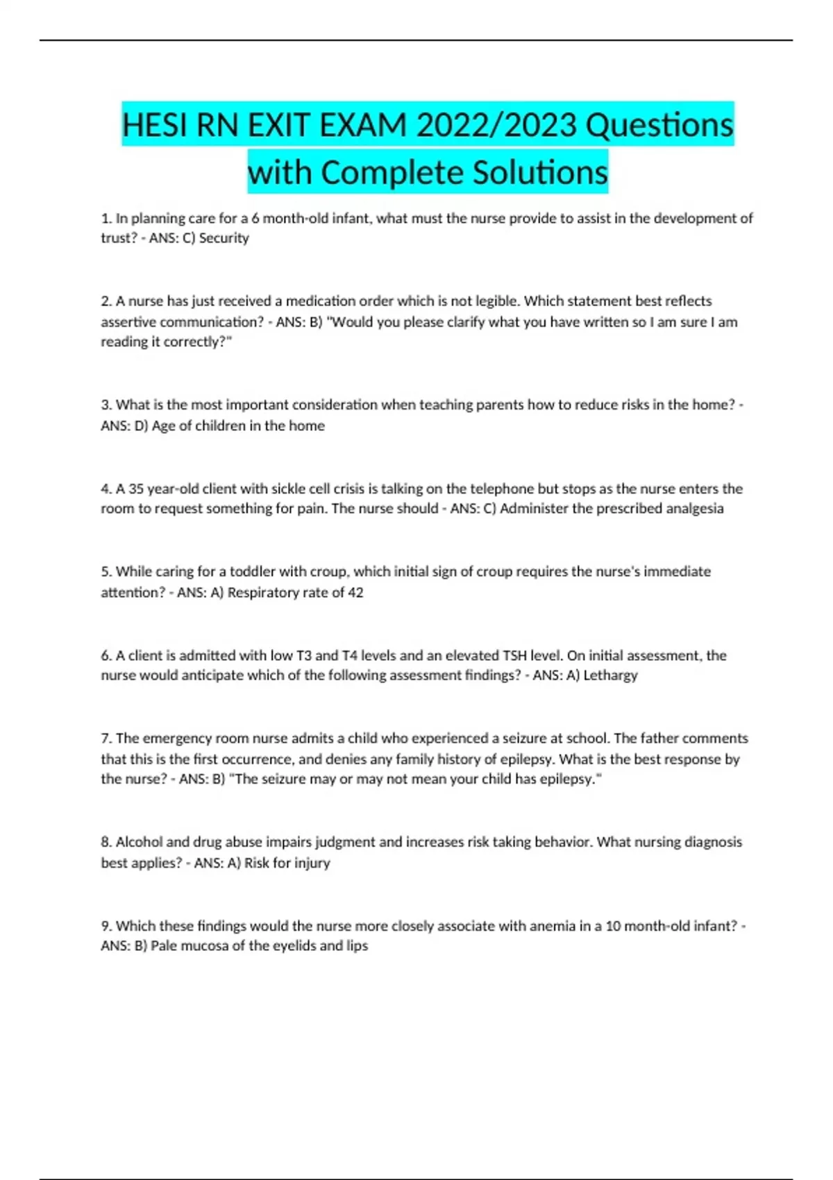 HESI RN EXIT EXAM 2022/2023 Questions with Complete Solutions 1. In planning care for a 6 month-old infant, what must the nurse provide to assist in the development of trust? - ANS: C) Security 2. A nurse has just received a medication order which is not legible. Which statement best reflects assertive communication? - ANS: B) "Would you please clarify what you have written so I am sure I am reading it correctly?" 3. What is the most important consideration when teaching parents how to reduce risks in the home? - ANS: D) Age of children in the home 4. A 35 year-old client with sickle cell crisis is talking on the telephone but stops as the nurse enters the room to request something for pain. The nurse should - ANS: C) Administer the prescribed analgesia 5. While caring for a toddler with croup, which initial sign of croup requires the nurse's immediate attention? - ANS: A) Respiratory rate of 42 6. A client is admitted with low T3 and T4 levels and an elevated TSH level. On initial assessment, the nurse would anticipate which of the following assessment findings? - ANS: A) Lethargy 7. The emergency room nurse admits a child who experienced a seizure at school. The father comments that this is the first occurrence, and denies any family history of epilepsy. What is the best response by the nurse? - ANS: B) "The seizure may or may not mean your child has epilepsy." 8. Alcohol and drug abuse impairs judgment and increases risk taking behavior. What nursing diagnosis best applies? - ANS: A) Risk for injury 9. Which these findings would the nurse more closely associate with anemia in a 10 month-old infant? - ANS: B) Pale mucosa of the eyelids and lips 10. The nurse is caring for a client in hypertensive crisis in an intensive care unit. The priority assessment in the first hour of care is - ANS: D) Pupil responses 11. Which of these clients who are all in the terminal stage of cancer is least appropriate to suggest the use of patient controlled analgesia (PCA) with a pump? - ANS: D) A preschooler with intermittent episodes of alertness 12. The nurse is about to assess a 6 month-old child with nonorganic failure-to thrive (NOFTT). Upon entering the room, the nurse would expect the baby to be - ANS: D) Pale, thin arms and legs, uninterested in surroundings 13. As the nurse is speaking with a group of teens which of these side effects of chemotherapy for cancer would the nurse expect this group to be more interested in during the discussion? - ANS: D) Hair loss 14. While caring for a client who was admitted with myocardial infarction (MI) 2 days ago, the nurse notes today's temperature is 101.1 degrees Fahrenheit (38.5 degrees Celsius). The appropriate nursing intervention is to - ANS: B) Administer acetaminophen as ordered as this is normal at this time 15. A client is admitted for first and second degree burns on the face, neck, anterior chest and hands. The nurse's priority should be - ANS: B) Assess for dyspnea or stridor 16. Which of these clients who call the community health clinic would the nurse ask to come in that day to be seen by the health care provider? - ANS: D) I went to the bathroom and my urine looked very red and it didn't hurt when I went. 17. Which of these parents' comment for a newborn would most likely reveal an initial finding of a suspected pyloric stenosis? - ANS: C) Mild vomiting that progressed to vomiting shooting across the room. 18. The nurse is assessing a child for clinical manifestations of iron deficiency anemia. Which factor would the nurse recognize as cause for the findings? - ANS: B) Tissue hypoxia 19. The nurse would expect the cystic fibrosis client to receive supplemental pancreatic enzymes along with a diet - ANS: A) High in carbohydrates and proteins 20. In evaluating the growth of a 12 month-old child, which of these findings would the nurse expect to be present in the infant? - ANS: C) Tripled the birth weight 21. A Hispanic client in the postpartum period refuses the hospital food because it is "cold." The best initial action by the nurse is to - ANS: B) Ask the client what foods are acceptable or bad 22. The father of an 8 month-old infant asks the nurse if his infant's vocalizations are normal for his age. Which of the following would the nurse expect at this age? - ANS: B) Imitation of sounds 23. The nurse should recognize that physical dependence is accompanied by what findings when alcohol consumption is first reduced or ended? - ANS: B) Withdrawal 24. Immediately following an acute battering incident in a violent relationship, the batterer may respond to the partner's injuries by - ANS: B) Minimizing the episode and underestimating the victim's injuries * 25. A client with pneumococcal pneumonia had been started on antibiotics 16 hours ago. During the nurse's initial evening rounds the nurse notices a foul smell in the room. The client makes all of these statements during their conversation. Which statement would alert the nurse to a complication? - ANS: B) "I have been coughing up foul-tasting, brown, thick sputum." 26. The nurse is performing an assessment on a client in congestive heart failure. Auscultation of the heart is most likely to reveal - ANS: A) S3 ventricular gallop 27. Which of these observations made by the nurse during an excretory urogram indicate a complicaton? - ANS: B) The client's entire body turns a bright red color 28. A client is diagnosed with a spontaneous pneumothorax necessitating the insertion of a chest tube. What is the best explanation for the nurse to provide this client? - ANS: B) "The tube will remove excess air from your chest." 29. The nurse is reviewing laboratory results on a client with acute renal failure. Which one of the following should be reported immediately? - ANS: D) Serum potassium 6 mEq/L 30. The nurse is caring for a client undergoing the placement of a central venous catheter line. Which of the following would require the nurse's immediate attention? - ANS: C) Dyspnea 31. The nurse is perfo