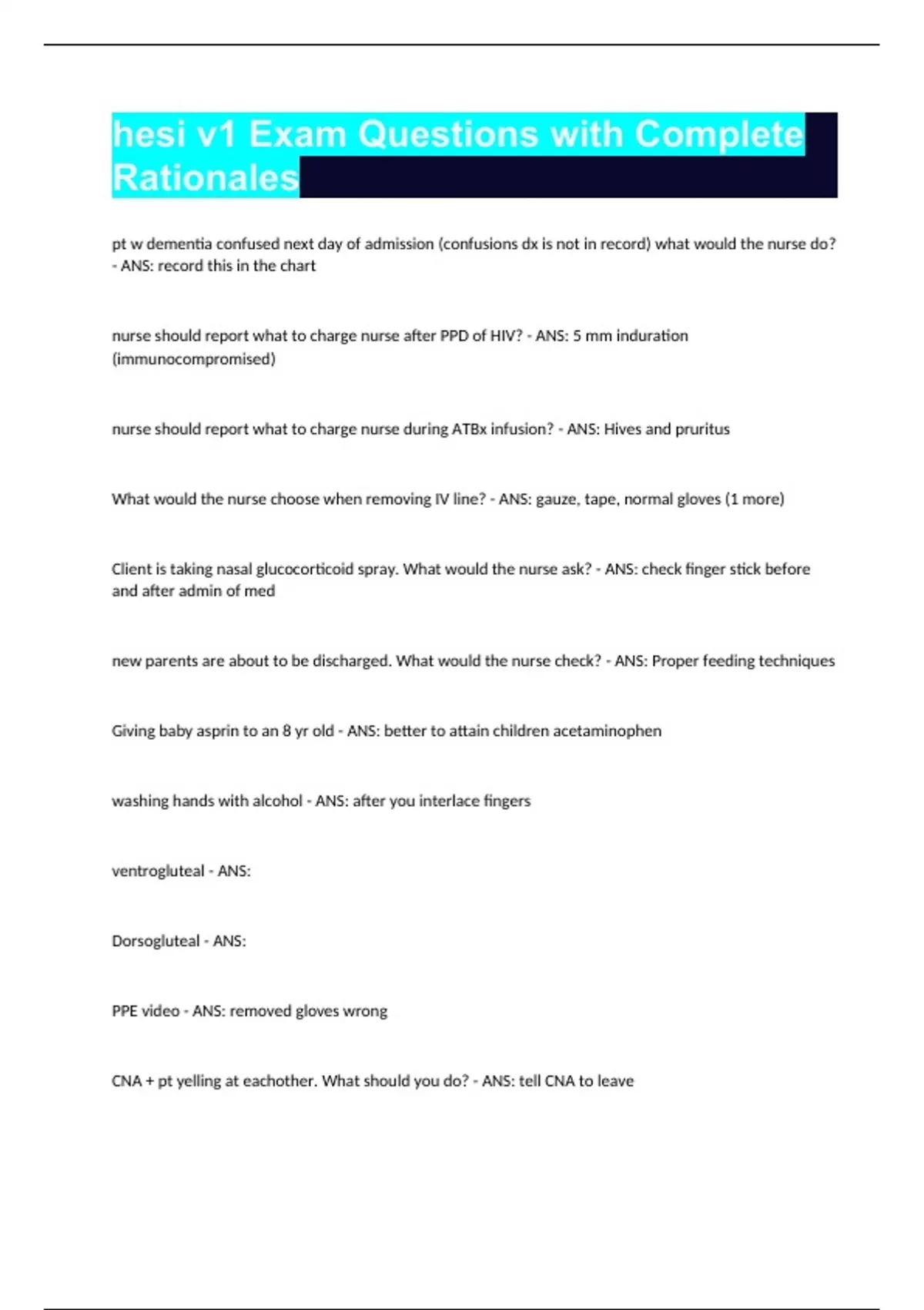 hesi v1 Exam Questions with Complete Rationales pt w dementia confused next day of admission (confusions dx is not in record) what would the nurse do? - ANS: record this in the chart nurse should report what to charge nurse after PPD of HIV? - ANS: 5 mm induration (immunocompromised) nurse should report what to charge nurse during ATBx infusion? - ANS: Hives and pruritus What would the nurse choose when removing IV line? - ANS: gauze, tape, normal gloves (1 more) Client is taking nasal glucocorticoid spray. What would the nurse ask? - ANS: check finger stick before and after admin of med new parents are about to be discharged. What would the nurse check? - ANS: Proper feeding techniques Giving baby asprin to an 8 yr old - ANS: better to attain children acetaminophen washing hands with alcohol - ANS: after you interlace fingers ventrogluteal - ANS: Dorsogluteal - ANS: PPE video - ANS: removed gloves wrong CNA + pt yelling at eachother. What should you do? - ANS: tell CNA to leave 6signs of child abuse? - ANS: brother hitting little sister marks on childs body one more choice how to see if UAP/ CNA knows how to do a skill? 1. ask if they have done the skill before? 2. watch if they can actually do it? - ANS: watch if they can actually do it what is the next step for a pt that is going to get several days of complete bed rest? 1. put shoes on 2. dangle their feet 3. get them up - ANS: dangle their feet question about skeletal traction (wt, ropes, pulleys used to apply force to tissues surrounding a broken bone) - ANS: alignment ventricular fibrillation - ANS: check to see if conscious begin CPR picture of a dressing that has been reinforced by the nurse. What should the nurse do next? - ANS: take VS case study w exhibit 1,2,3 (safe is 1:8) - ANS: focus on 3 where it shoes lab value 1:5 rubella admin rubella vaccine which group of populations the nurse should asses for scoliosis? - ANS: young girl mother of a 10 yr old say son "fell out of tree" what indication of child abuse? - ANS: hx of children hx of mother are different s/s of pneumomia - ANS: cough, fever, chills, tachycardia, dyspnea pt admitted to ER w dx of pneumonia what interventions should you do to avoid further complications? - ANS: ambulate w pt doctor prescribed 120mg of med, patient already have 30mg/tab and has already received 2. How many will the nurse administer? - ANS: 120/30= 4 4/2= 2 give 2 more patient has carotid endarterectomy. How to observe for s/s of bleeding? - ANS: Check area around the neck and elbow a nurse is talking loudly in the hall and everybody can hear h