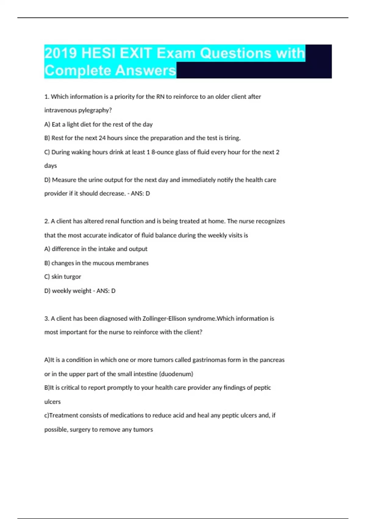 2019 HESI EXIT Exam Questions with Complete Answers 1. Which information is a priority for the RN to reinforce to an older client after intravenous pylegraphy? A) Eat a light diet for the rest of the day B) Rest for the next 24 hours since the preparation and the test is tiring. C) During waking hours drink at least 1 8-ounce glass of fluid every hour for the next 2 days D) Measure the urine output for the next day and immediately notify the health care provider if it should decrease. - ANS: D 2. A client has altered renal function and is being treated at home. The nurse recognizes that the most accurate indicator of fluid balance during the weekly visits is A) difference in the intake and output B) changes in the mucous membranes C) skin turgor D) weekly weight - ANS: D 3. A client has been diagnosed with Zollinger-Ellison syndrome.Which information is most important for the nurse to reinforce with the client? A)It is a condition in which one or more tumors called gastrinomas form in the pancreas or in the upper part of the small intestine (duodenum) B)It is critical to report promptly to your health care provider any findings of peptic ulcers c)Treatment consists of medications to reduce acid and heal any peptic ulcers and, if possible, surgery to remove any tumors D)With the average age at diagnosis at 50 years the peptic ulcers may occur at unusual areas of the stomach or intestine - ANS: B 4. A primigravida in the third trimester is hospitalized for preeclampsia. The nurse determines that the client's blood pressure is increasing. Which action should the nurse take first? A) Check the protein level in urine B) Have the client turn to the left side C) Take the temperature D) Monitor the urine output - ANS: B 5. The nurse is caring for a client in atrial fibrillation. The atrial heart rate is 250 and the ventricular rate is controlled at 75. Which of the following findings is cause for the most concern? A) Diminished bowel sounds B) Loss of appetite C) A cold, pale lower leg D) Tachypnea - ANS: C 6. The client with infective endocarditis must be assessed frequently by the home health nurse. Which finding suggests that antibiotic therapy is not effective, and must be reported by the nurse immediately to the healthcare provider? A) Nausea and vomiting B) Fever of 103 degrees Fahrenheit (39.5 degrees Celsius) C) Diffuse macular rash D) Muscle tenderness - ANS: B 7. A client who had a vasectomy is in the post recovery unit at an outpatient clinic. Which of these points is most important to be reinforced by the nurse? A) Until the health care provider has determined that your ejaculate doesn't contain sperm, continue to use another form of contraception. B)This procedure doesn't impede the production of male hormones or the production of sperm in the testicles. The sperm can no longer enter your semen and no sperm are in your ejaculate. C) After your vasectomy, strenuous activity needs to be avoided for at least 48 hours. If your work doesn't involve hard physical labor, you can return to your job as soon as you feel up to it. The stitches generally dissolve in seven to ten days. D)The health care provider at this clinic recommends rest, ice, an athletic supporter or over-the-counter pain medication to relieve any discomfort. - ANS: 1. Which information is a priority for the RN to reinforce to an older client after intravenous pylegraphy? A) Eat a light diet for the rest of the day B) Rest for the next 24 hours since the preparation and the test is tiring. C) During waking hours drink at least 1 8-ounce glass of fluid every hour for the next 2 days D) Measure the urine output for the next day and immediately notify the health care provider if it should decrease. - ANS: D 2. A client has altered renal function and is being treated at home. The nurse recognizes that the most accurate indicator of fluid balance during the weekly visits is A) difference in the intake and output B) changes in the mucous membranes C) skin turgor D) weekly weight - ANS: D 3. A client has been diagnosed with Zollinger-E