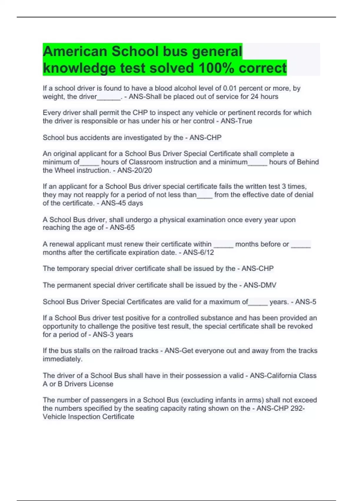 American School bus general knowledge test solved 100% correct