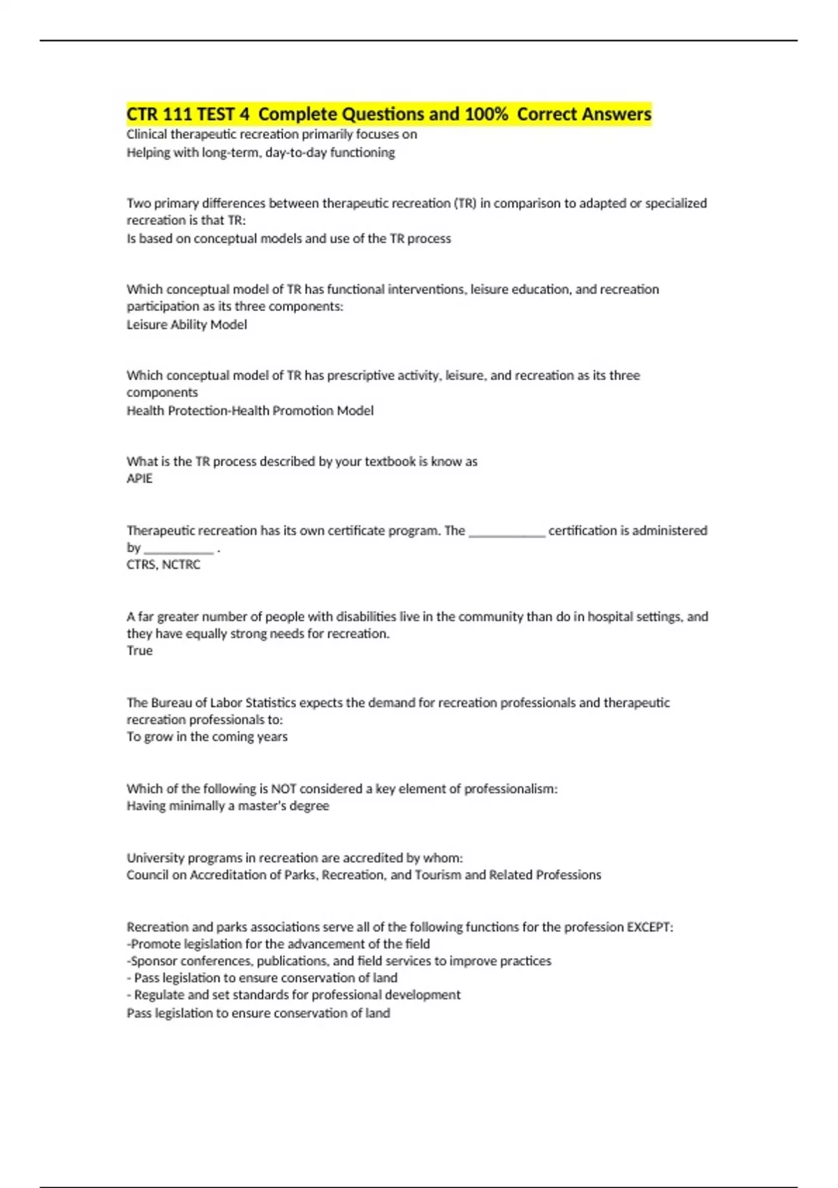 CTR 111 TEST 4 Complete Questions and 100% Correct Answers Clinical therapeutic recreation primarily focuses on Helping with long-term, day-to-day functioning Two primary differences between therapeutic recreation (TR) in comparison to adapted or specialized recreation is that TR: Is based on conceptual models and use of the TR process Which conceptual model of TR has functional interventions, leisure education, and recreation participation as its three components: Leisure Ability Model Which conceptual model of TR has prescriptive activity, leisure, and recreation as its three components Health Protection-Health Promotion Model What is the TR process described by your textbook is know as APIE Therapeutic recreation has its own certificate program. The ___________ certification is administered by __________ . CTRS, NCTRC A far greater number of people with disabilities live in the community than do in hospital settings, and they have equally strong needs for recreation. True The Bureau of Labor Statistics expects the demand for recreation professionals and therapeutic recreation professionals to: To grow in the coming years Which of the following is NOT considered a key element of professionalism: Having minimally a master's degree University programs in recreation are accredited by whom: Council on Accreditation of Parks, Recreation, and Tourism and Related Professions Recreation and parks associations serve all of the following functions for the profession EXCEPT: -Promote legislation for the advancement of the field -Sponsor conferences, publications, and field services to improve practices - Pass legislation to ensure conservation of land - Regulate and set standards for professional development Pass legislation to ensure conservation of land